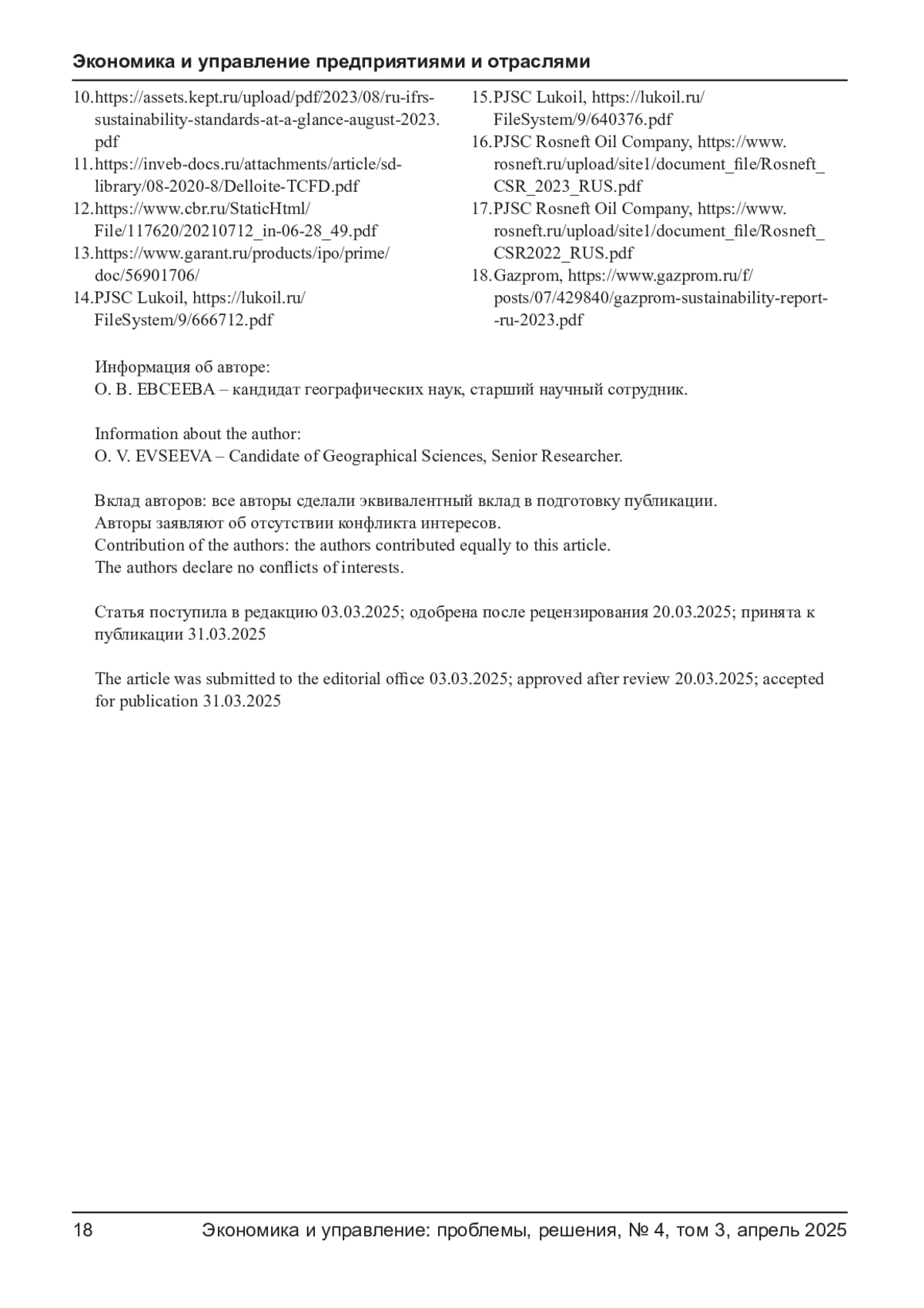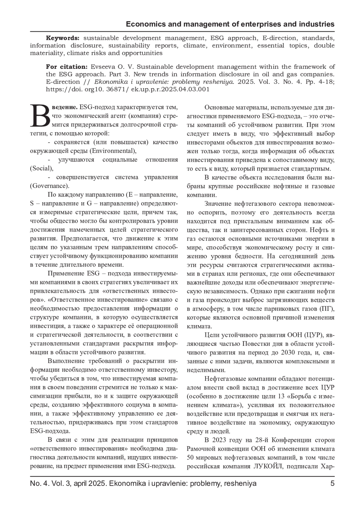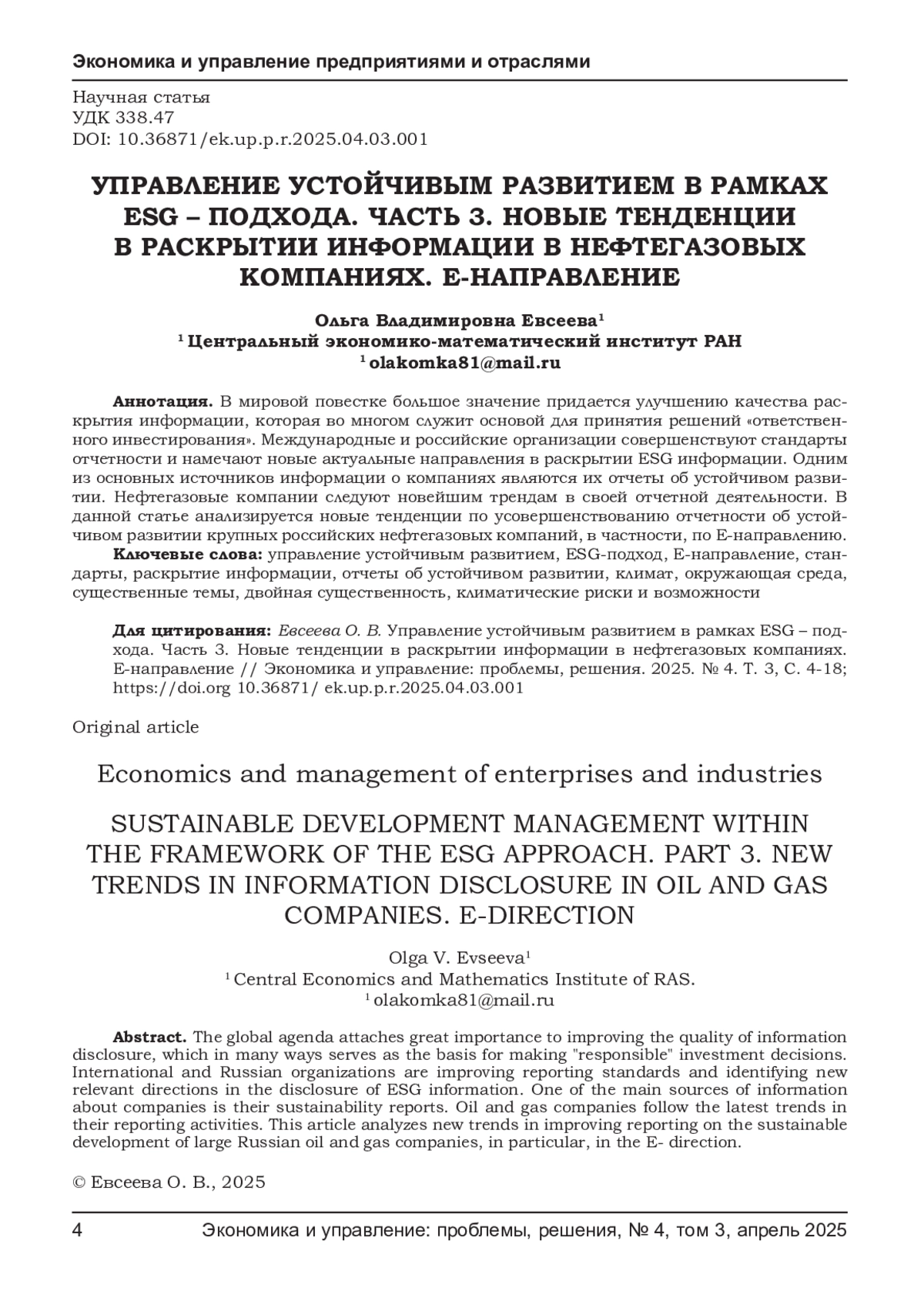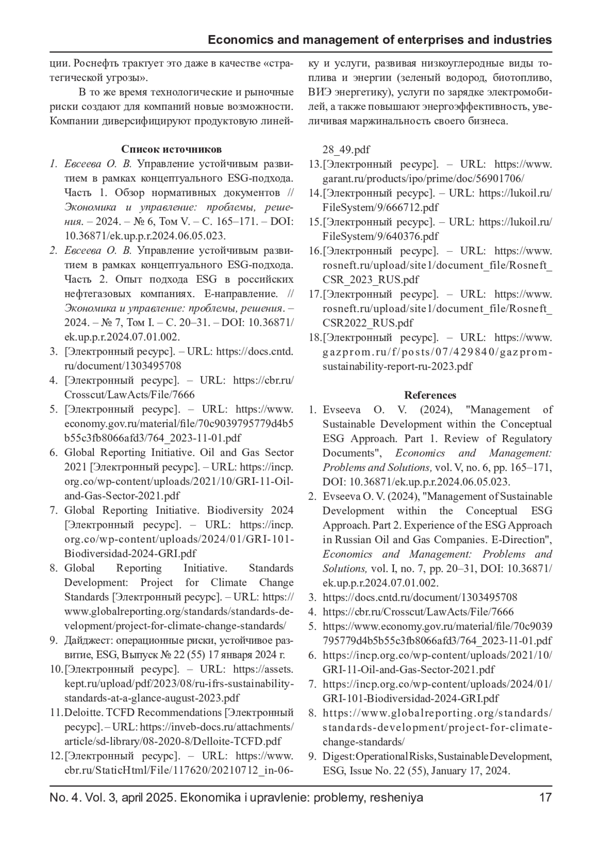 2. Евсеева О. В. Управление устойчивым развитием в рамках концептуального ESG-подхода. Часть 2. Опыт подхода ESG в российских нефтегазовых компаниях. Е-направление. // Экономика и управление: проблемы, решения. - 2024. - № 7, Том I. - С. 20-31. -. DOI: 10.36871/ek.up.p.r.2024.07.01.002 EDN: ZQHSIM