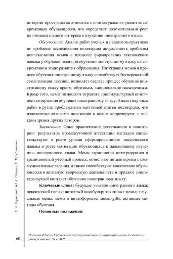 БАРОНЕНКО Е. А., РАЙСВИХ Ю. А., НИКИТИНА Е. Ю. ОБУЧАЮЩИЙ ПОТЕНЦИАЛ МЕМОВ ДЛЯ ФОРМИРОВАНИЯ ЛЕКСИЧЕСКОГО НАВЫКА В ПРОЦЕССЕ ОБУЧЕНИЯ ИНОСТРАННОМУ ЯЗЫКУ // ВЕСТНИК ЮЖНО-УРАЛЬСКОГО ГОСУДАРСТВЕННОГО ГУМАНИТАРНО-ПЕДАГОГИЧЕСКОГО УНИВЕРСИТЕТА. 2025. № 1 (185)