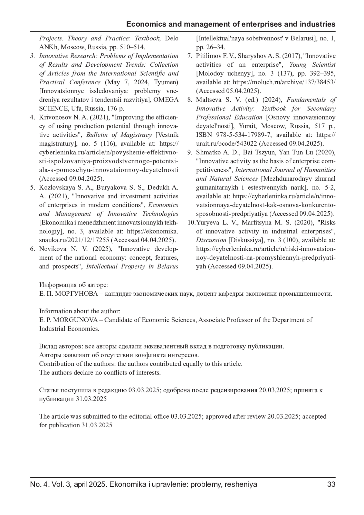 6. Новикова Н. В. Инновационное развитие национальной экономики: понятие, особенности и перспективы // Интеллектуальная собственность в Беларуси. - 2025. - № 1. - С. 26-34. EDN: NTVAID