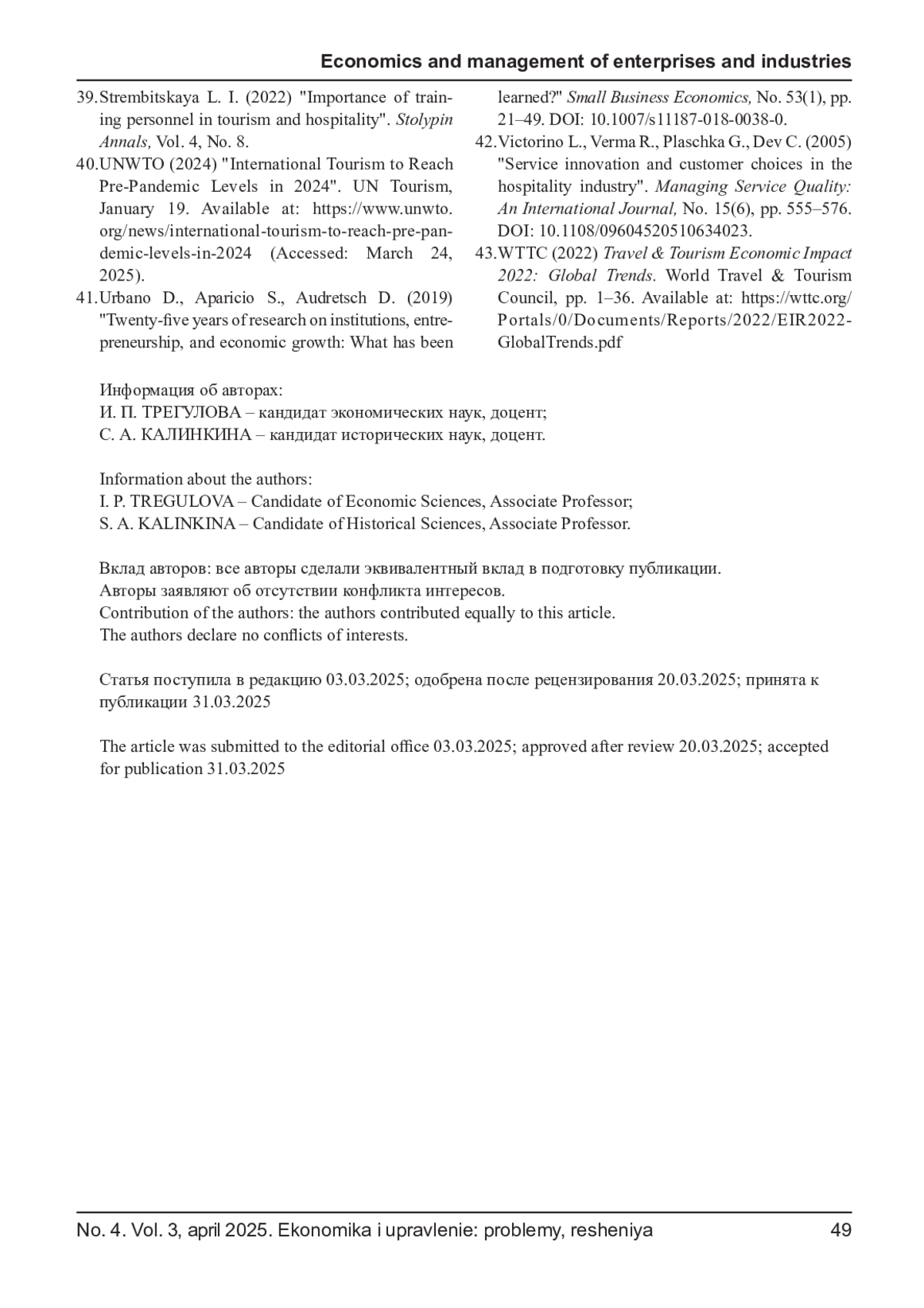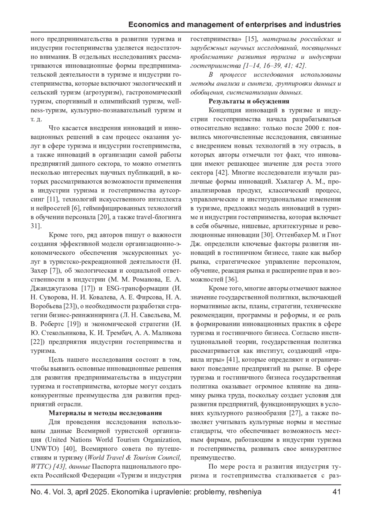 38. Sharma G., Taheri B., Cichon D., Parihar J., Kharbanda A. Using innovation and entrepreneurship for creating edge in service firms: A review research of tourism and hospitality industry // Journal of Innovation & Knowledge. - 2024. - №- P. 100572. DOI: 10.1016/j.jik.2024.100572 EDN: CRWRWL