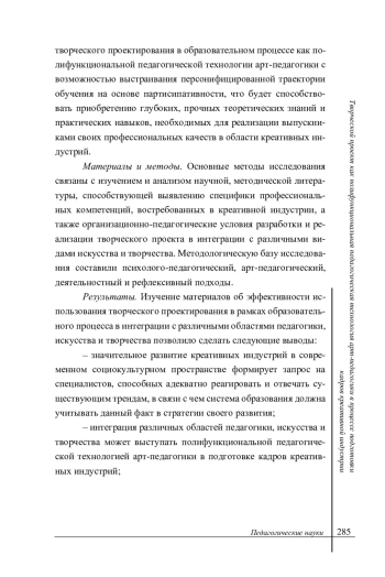 Результаты. Изучение материалов об эффективности использования творческого проектирования в рамках образовательного процесса в интеграции с различными областями педагогики, искусства и творчества позволило сделать следующие выводы: - значительное развитие креативных индустрий в современном социокультурном пространстве формирует запрос на специалистов, способных адекватно реагировать и отвечать существующим трендам, в связи с чем система образования должна учитывать данный факт в стратегии своего развития; - интеграция различных областей педагогики, искусства и творчества может выступать полифункциональной педагогической технологией арт-педагогики в подготовке кадров креативных индустрий; - для успешной и эффективной реализации творческого проектирования в образовательном процессе у всех субъектов, задействованных в данном процессе, необходим определенный уровень проектной культуры, который должен соответствовать каждому этапу. Проведенное исследование творческого проектирования в вузе как полифункциональной педагогической технологии арт-педагогики показало эффективность ее использования в контексте подготовки кадров креативной индустрии. Установлена многовекторность формирования и развития практических компетенций у студентов-хореографов с помощью творческого проектирования, востребованных в социокультурном пространстве и в креативных индустриях.