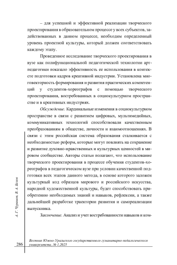 Обсуждение. Кардинальные изменения в социокультурном пространстве в связи с развитием цифровых, мультимедийных, коммуникативных технологий способствовали качественным преобразованиям в обществе, личности и взаимоотношениях. В связи с этим российская система образования сталкивается с необходимостью реформ, которые могут повлиять на сохранение и развитие духовно-нравственных и культурных ценностей в мировом сообществе. Авторы статьи полагают, что использование творческого проектирования в процессе обучения студентов-хореографов в педагогическом вузе при условии качественной подготовки всех этапов данного метода, в основе которого заложен культурный код образцов мирового и российского искусства, народной художественной культуры, будет способствовать приобретению необходимых знаний и навыков, рефлексии, а также дальнейшей разработке траектории развития и самореализации выпускника.