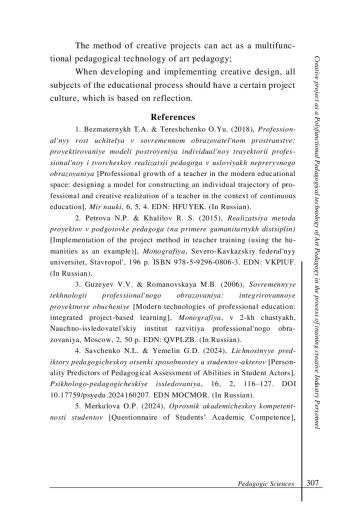 Заключение. Анализ и учет востребованности навыков и ком- петенций у специалистов креативных индустрий должен стать одним из главных факторов, влияющих на реформирование российского образования. Успешная разработка и реализация метода творческих проектов как полифункциональной педагогической технологии арт-педагогики возможно при определенной технологической культуре субъектов образовательного процесса. Основные положения: - анализ и учет запроса креативных индустрий на специалистов с определенным набором компетенций должен учитываться при выстраивании персонифицированной траектории обучения; - метод творческих проектов может выступать как полифункциональная педагогическая технология арт-педагогики; - при разработке и реализации творческого проектирования у всех субъектов образовательного процесса должна быть сформирована определенная проектная культура, в основе которой заложена рефлексия.