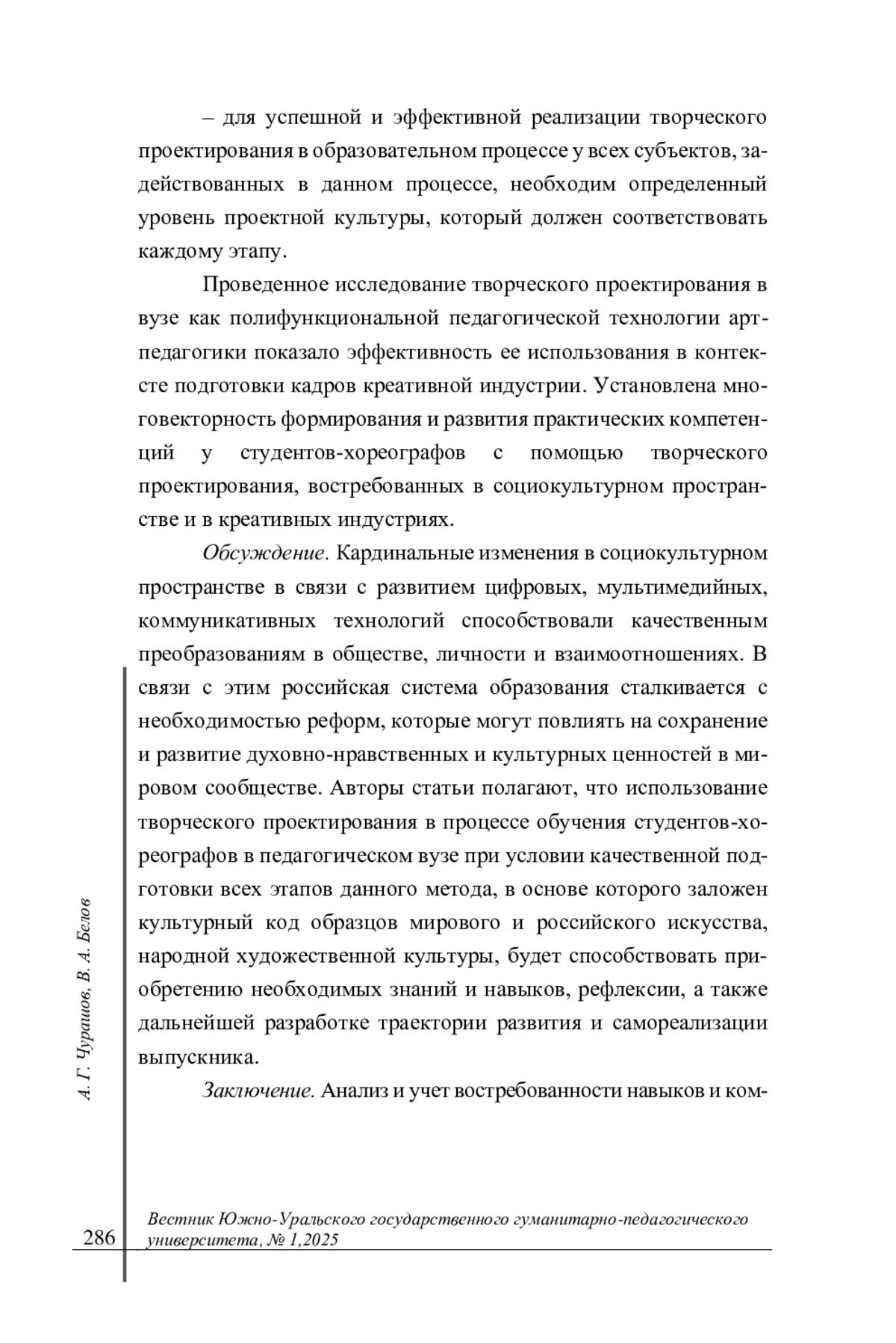 Введение. В статье анализируется состояние системы образования в контексте современной социокультурной среды, а также влияние развития креативных индустрий на необходимость получения соответствующих компетенций у выпускников педагогических вузов, способных быть востребованными и конкурентоспособными специалистами. Рассматриваются технологические аспекты формирования и развития творческих способностей у студентов-хореографов в интеграции с различными видами искусств и творческой деятельности. Предлагается использование творческого проектирования в образовательном процессе как полифункциональной педагогической технологии арт-педагогики с возможностью выстраивания персонифицированной траектории обучения на основе партисипативности, что будет способствовать приобретению глубоких, прочных теоретических знаний и практических навыков, необходимых для реализации выпускниками своих профессиональных качеств в области креативных индустрий.