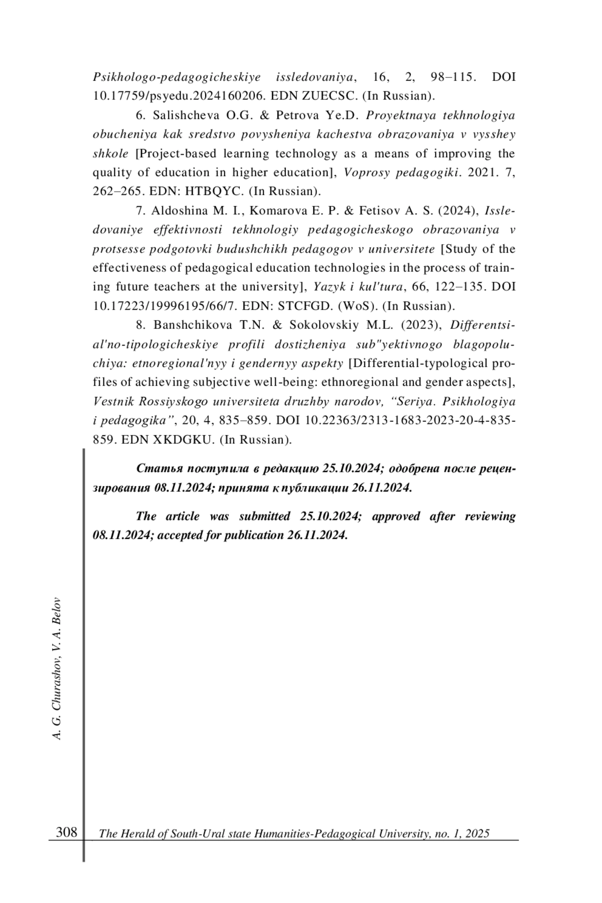 7. Алдошина М. И., Комарова Э. П., Фетисов А. С. Исследование эффективности технологий педагогического образования в процессе подготовки будущих педагогов в университете // Язык и культура. 2024. № 66. С. 122-135. 10.17223/19996195/66/7. (WoS). DOI: 10.17223/19996195/66/7.WoS EDN: STCFGD