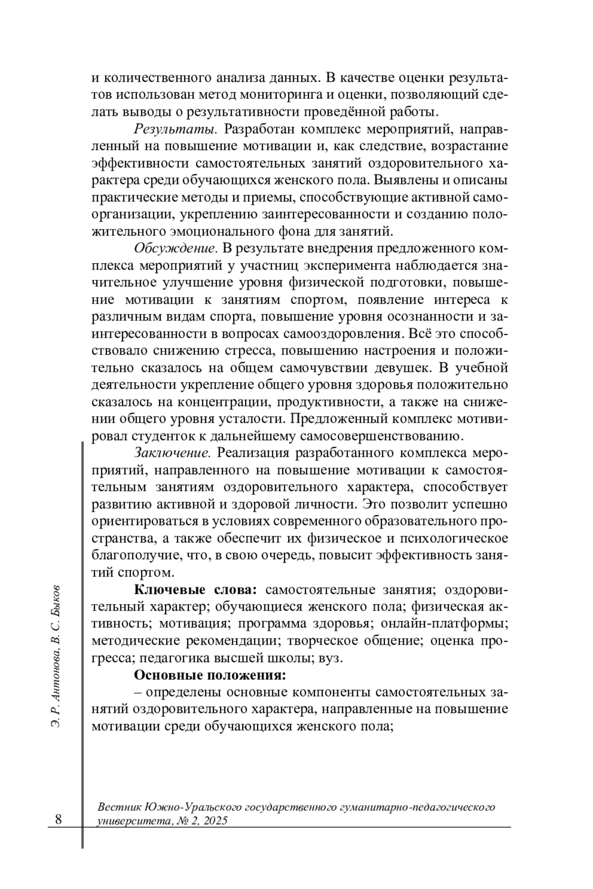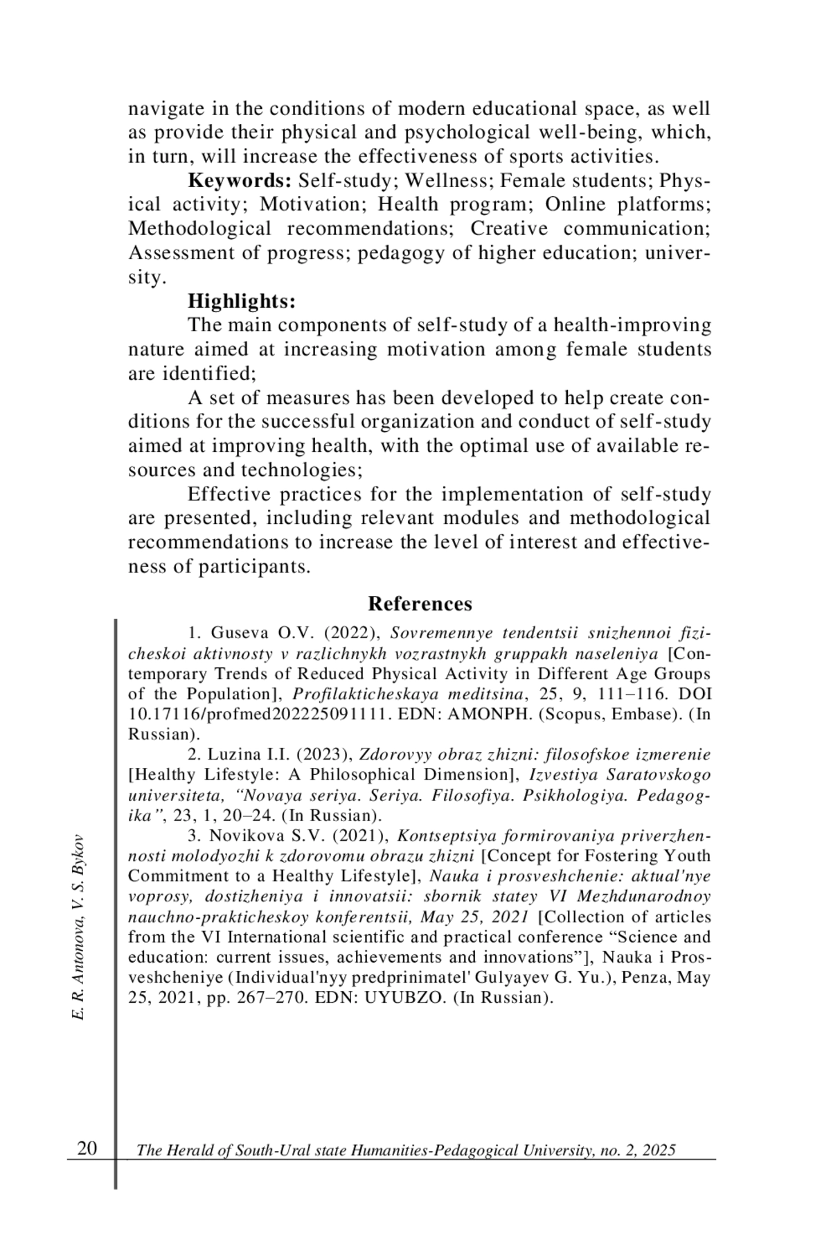 АНТОНОВА Э. Р., БЫКОВ В. С. САМОСТОЯТЕЛЬНЫЕ ЗАНЯТИЯ ОЗДОРОВИТЕЛЬНОГО ХАРАКТЕРА ОБУЧАЮЩИХСЯ ЖЕНСКОГО ПОЛА В ВУЗЕ // ВЕСТНИК ЮЖНО-УРАЛЬСКОГО ГОСУДАРСТВЕННОГО ГУМАНИТАРНО-ПЕДАГОГИЧЕСКОГО УНИВЕРСИТЕТА. 2025. № 2 (186)