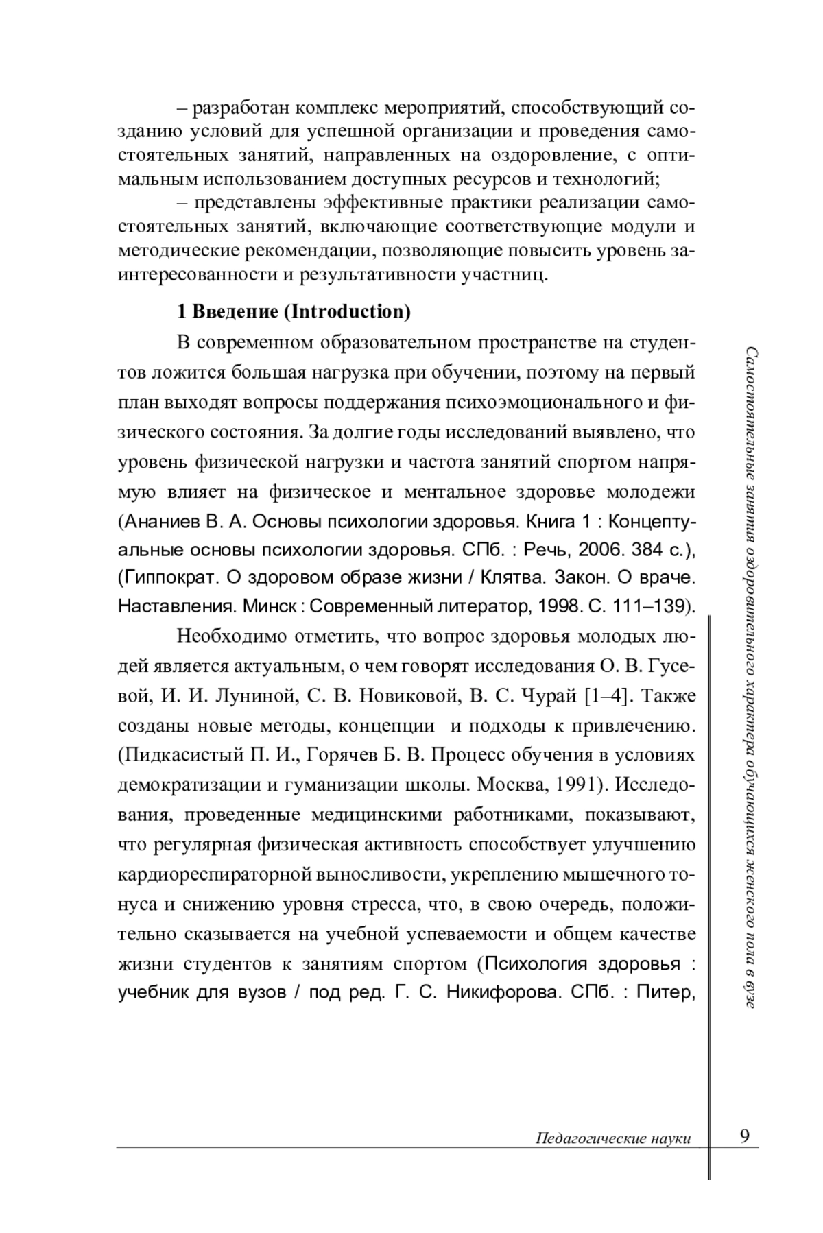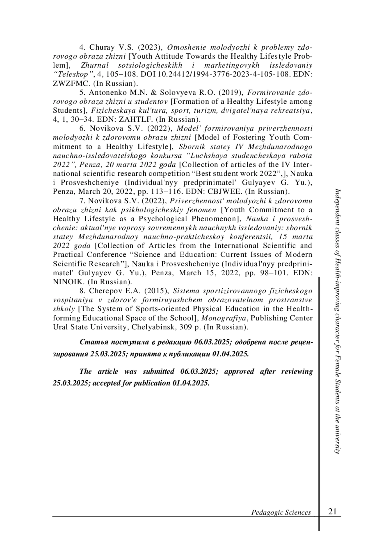 Статья: САМОСТОЯТЕЛЬНЫЕ ЗАНЯТИЯ ОЗДОРОВИТЕЛЬНОГО ХАРАКТЕРА ОБУЧАЮЩИХСЯ ЖЕНСКОГО ПОЛА В ВУЗЕ (2025)