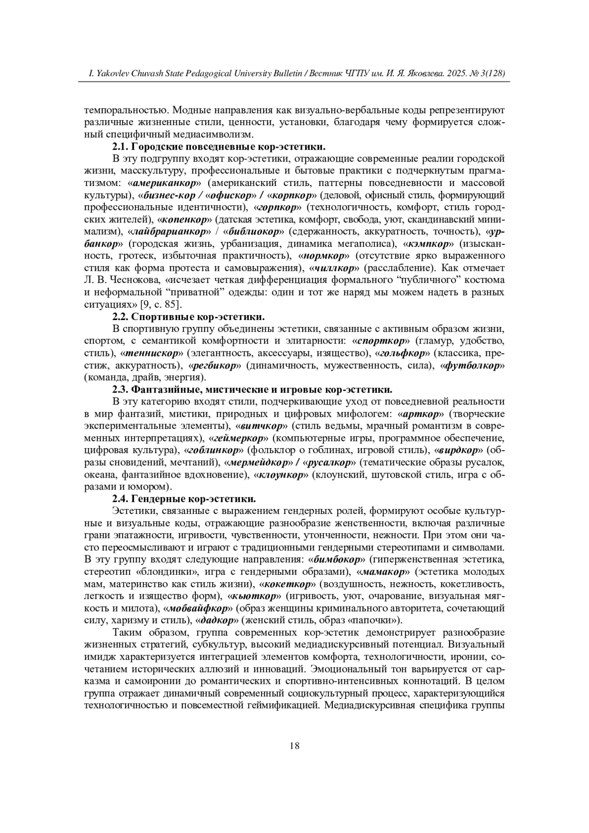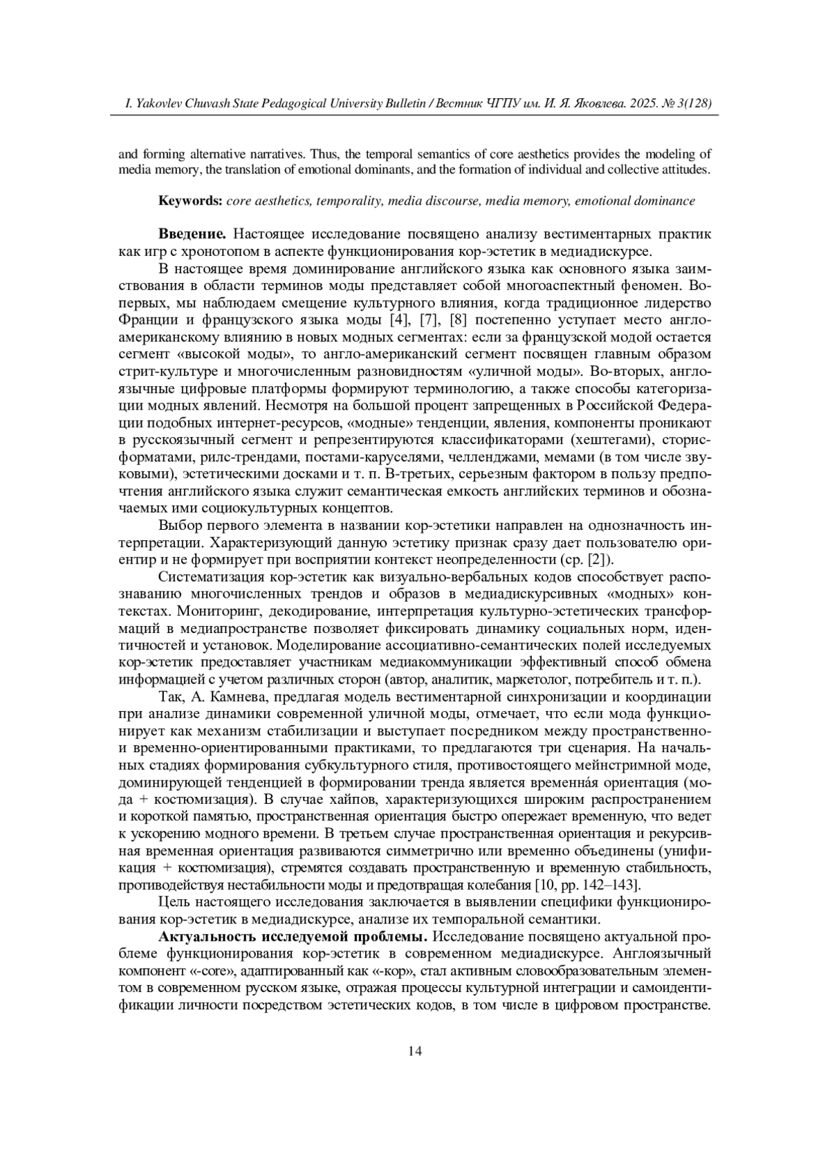 Голикова Т. А. Вестиментарные практики как игры с хронотопом: функционирование кор-эстетик в медиадискурсе // Вестник Чувашского государственного педагогического университета им. И.Я. Яковлева. – 2025. – №3 (128). – С. 13–20. DOI 10.37972/chgpu.2025.128.3.002.
