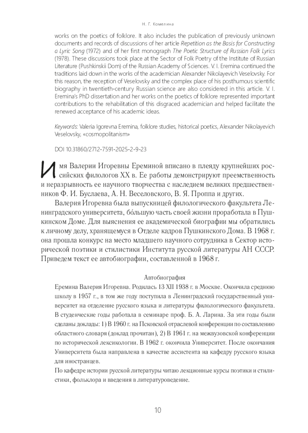 Статья посвящена научной биографии доктора филологических наук Валерии Игоревны Ереминой (1938–2023), известного ученого, текстолога, специалиста по поэтике, стилистике фольклора и истории фольклористики. Рассмотрены некоторые работы В. И. Ереминой о поэтике фольклора. Публикуются ранее неизвестные документы и протоколы обсуждений на заседаниях Сектора народнопоэтического творчества Института русской литературы (Пушкинский Дом) РАН ее статьи «Повтор как основа построения лирической песни» (1972) и первой монографии «Поэтический строй русской народной лирики» (1978). В. И. Еремина продолжила традиции, заложенные в работах академика А. Н. Веселовского. Поэтому рецепция Веселовского и его непростая посмертная научная биография в российской науке ХХ в. также являются одной из тем настоящей статьи. Кандидатская диссертация и работы по поэтике фольклора В. И. Ереминой были важным вкладом в реабилитацию и возвращение в науку идей опального академика.