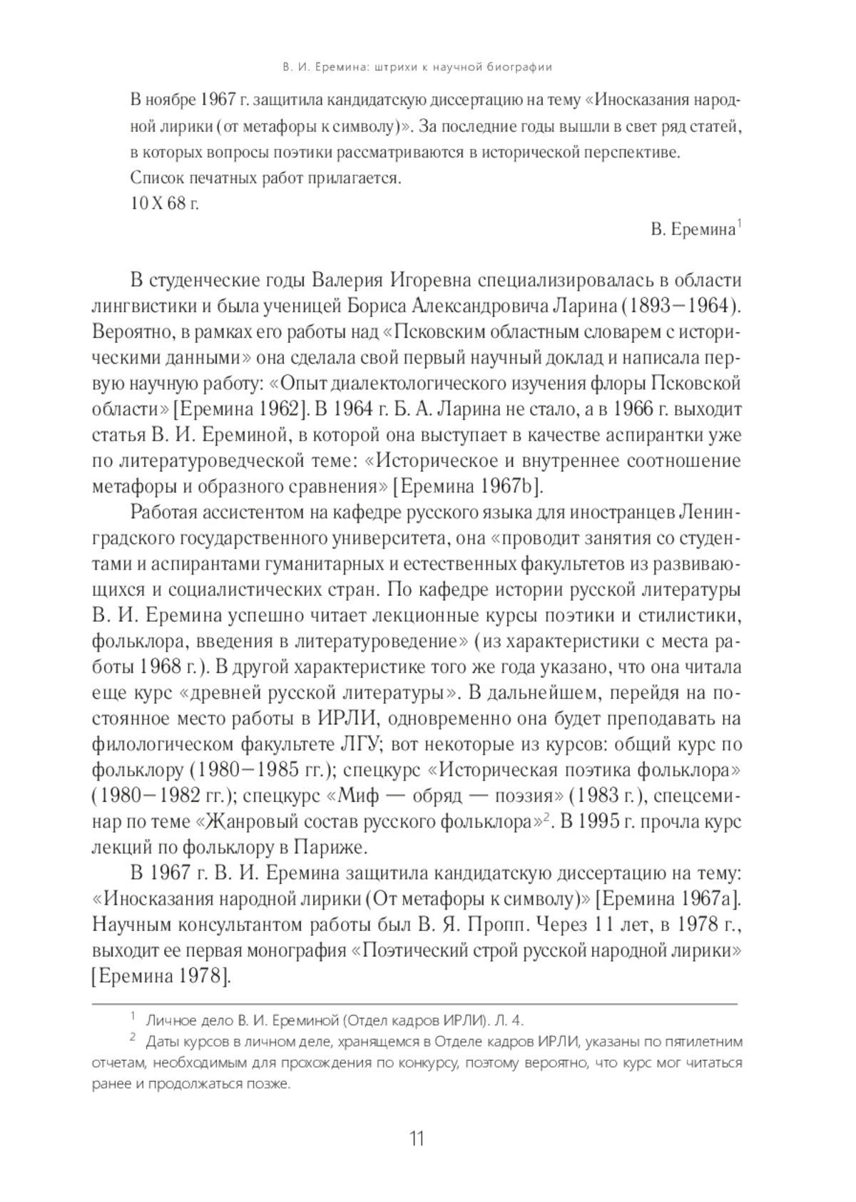 Имя Валерии Игоревны Ереминой вписано в плеяду крупнейших рос‑ сийских филологов ХХ в. Ее работы демонстрируют преемственность и неразрывность ее научного творчества с наследием великих предшественников Ф. И. Буслаева, А. Н. Веселовского, В. Я. Проппа и других