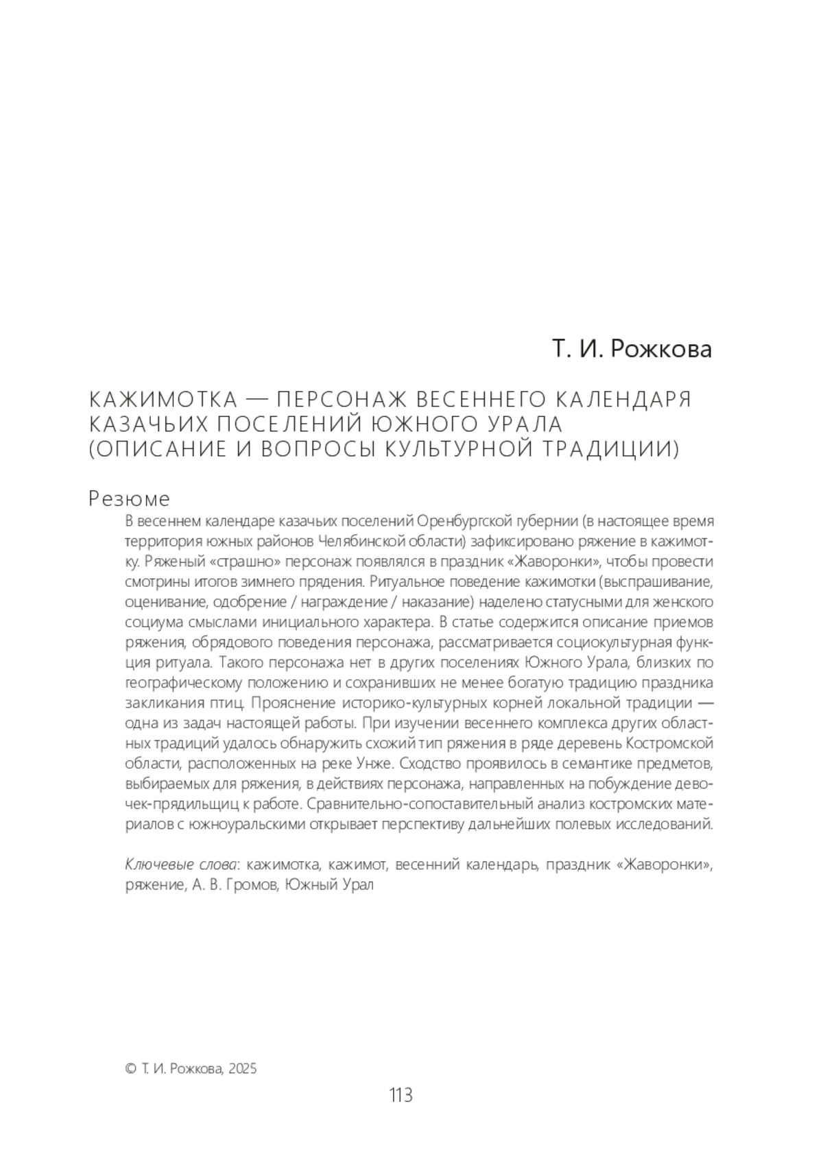 В весеннем календаре казачьих поселений Оренбургской губернии (в настоящее время территория южных районов Челябинской области) зафиксировано ряжение в кажимотку. Ряженый «страшно» персонаж появлялся в праздник «Жаворонки», чтобы провести смотрины итогов зимнего прядения. Ритуальное поведение кажимотки (выспрашивание, оценивание, одобрение / награждение / наказание) наделено статусными для женского социума смыслами инициального характера. В статье содержится описание приемов ряжения, обрядового поведения персонажа, рассматривается социокультурная функция ритуала. Такого персонажа нет в других поселениях Южного Урала, близких по географическому положению и сохранивших не менее богатую традицию праздника закликания птиц. Прояснение историко-культурных корней локальной традиции — одна из задач настоящей работы. При изучении весеннего комплекса других областных традиций удалось обнаружить схожий тип ряжения в ряде деревень Костромской области, расположенных на реке Унже. Сходство проявилось в семантике предметов, выбираемых для ряжения, в действиях персонажа, направленных на побуждение девочек-прядильщиц к работе. Сравнительно-сопоставительный анализ костромских материалов с южноуральскими открывает перспективу дальнейших полевых исследований