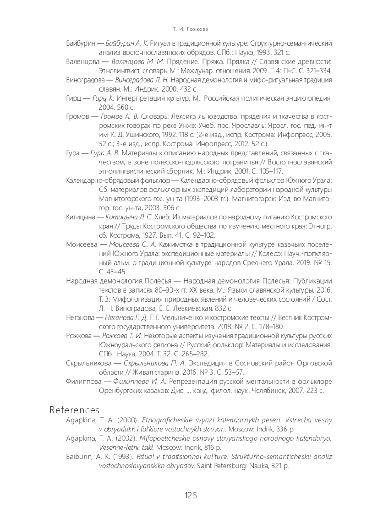 14. Рожкова Т. И. Некоторые аспекты изучения традиционной культуры русских Южноуральского региона // Русский фольклор: Материалы и исследования. СПб.: Наука, 2004. Т. 32. С. 265-282. EDN: XGIWZZ