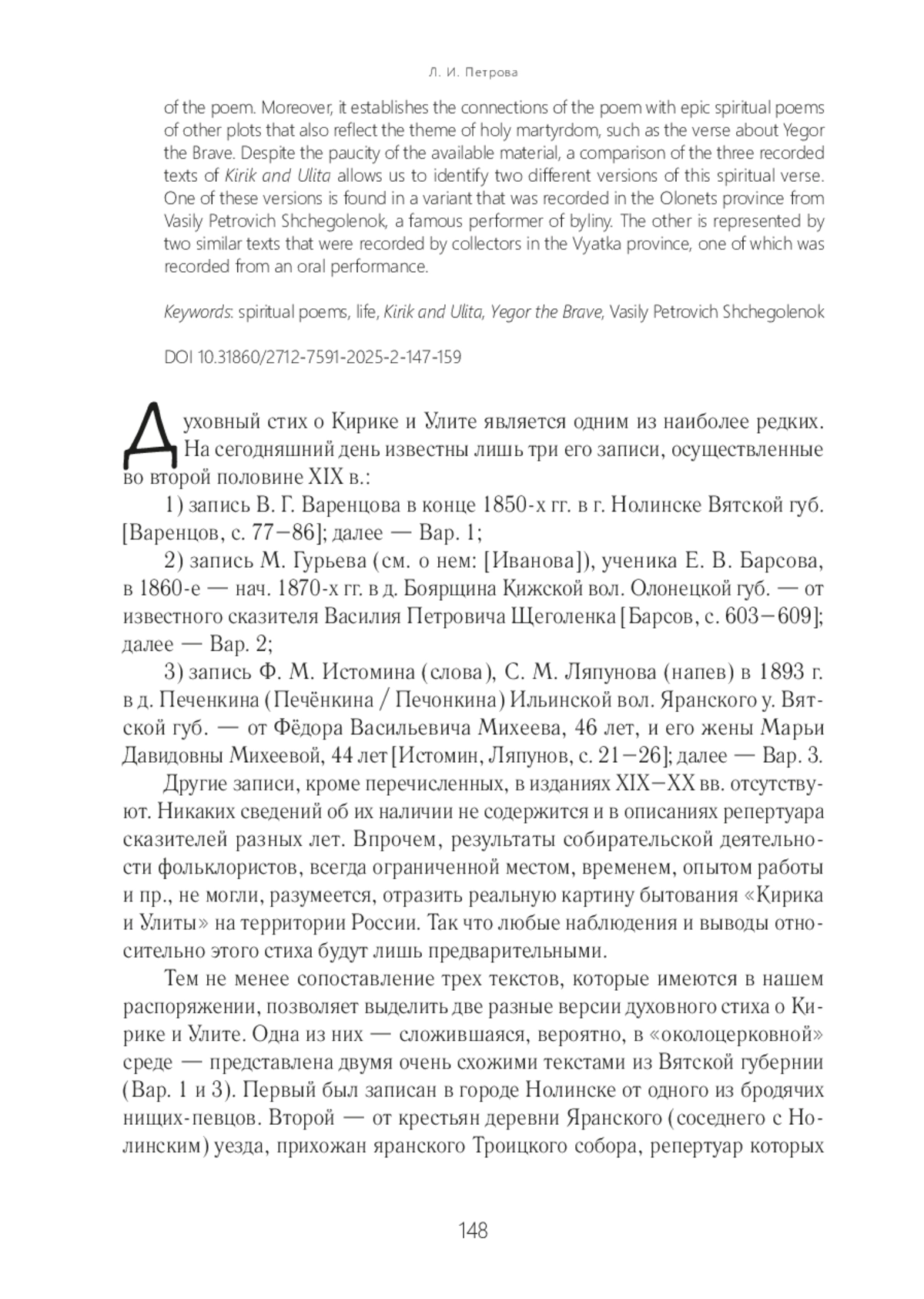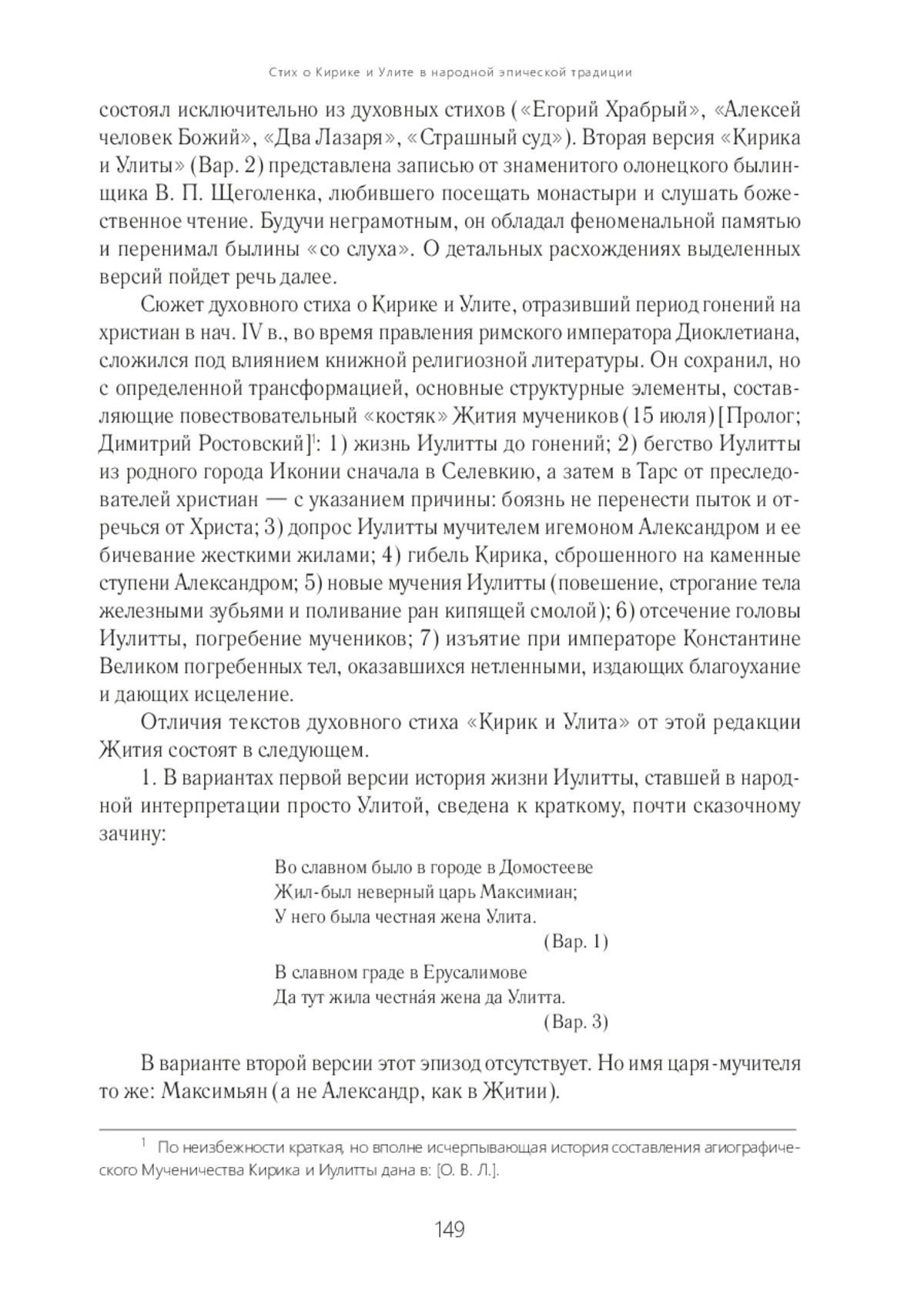 Статья посвящена одному из наиболее редких эпических духовных стихов устной традиции. Известны всего лишь три его записи, осуществленные во второй половине XIX столетия. Сюжет, восходящий к житийной литературе, отразил период гонений на христиан в нач. IV в., во время правления римского императора Диоклетиана. В основе статьи выявление сходств и отличий вариантов стиха и установление его связей с эпическими духовными стихами других сюжетов, также отразившими тему святого мученичества. Главным образом это стих о Егории Храбром. Несмотря на крайнюю скудость материала для анализа, сопоставление трех зафиксированных текстов «Кирика и Улиты» позволяет выделить две разные версии этого духовного стиха. Одна из них представлена вариантом, записанным в Олонецкой губернии от известного былинщика Василия Петровича Щеголенка, другая — двумя близкими текстами, зафиксированными собирателями в Вятской губернии, один из которых был записан с пения.