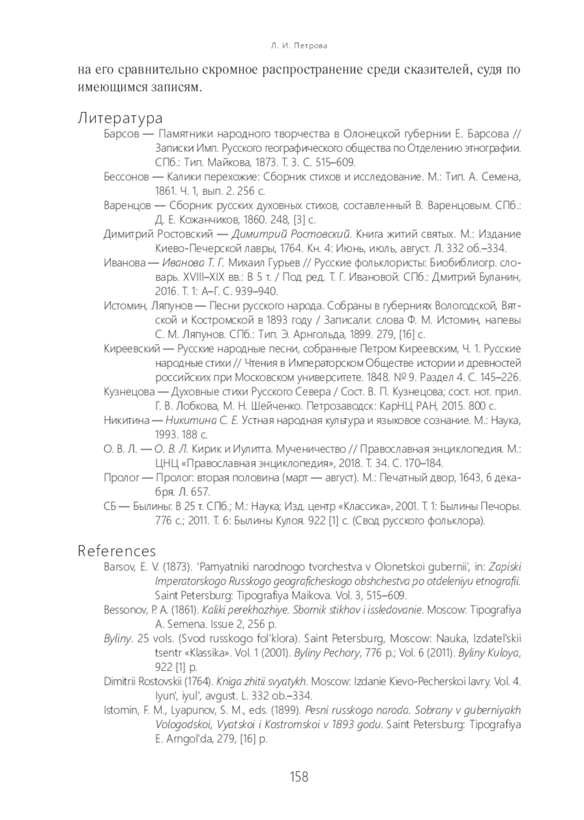 1. Памятники народного творчества в Олонецкой губернии Е. Барсова // Записки Имп. Русского географического общества по Отделению этнографии. СПб.: Тип. Майкова, 1873. Т. 3. С. 515-609.