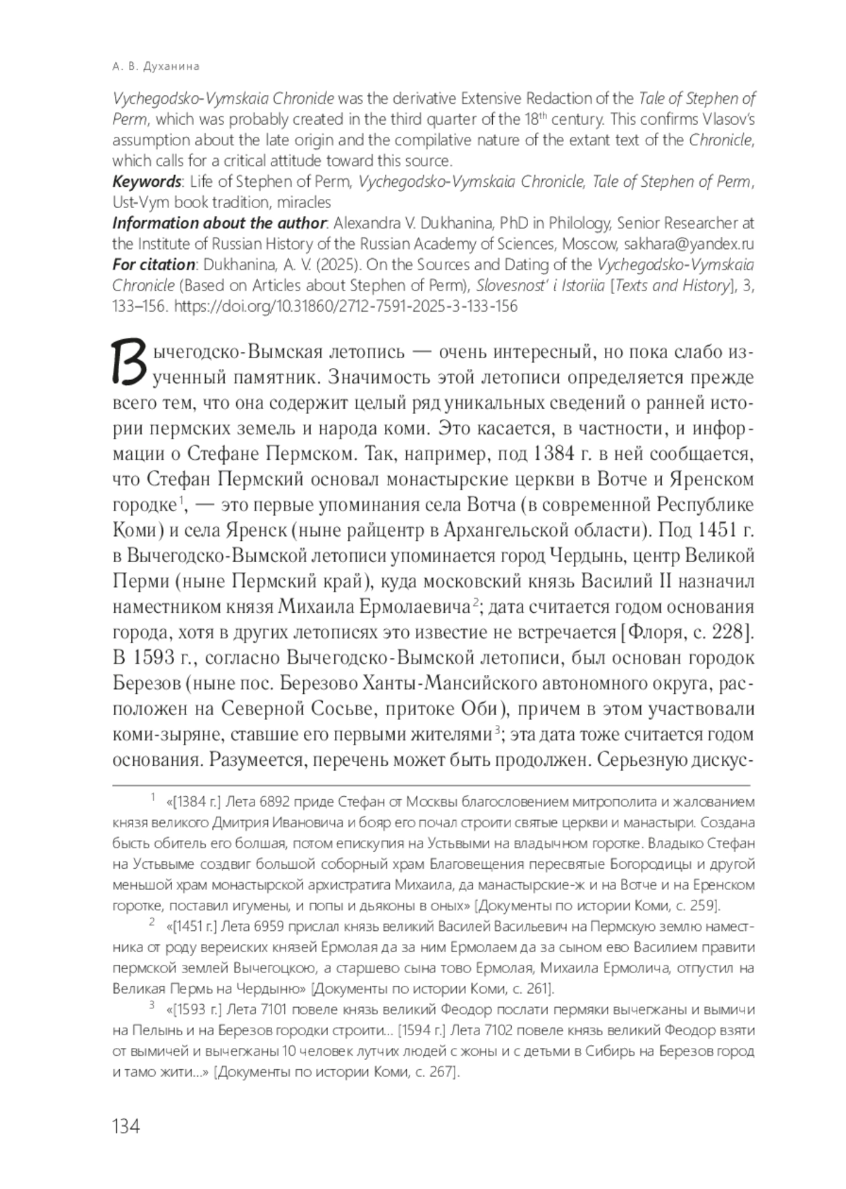 Вычегодско-Вымская летопись — очень интересный, но пока слабо изученный памятник. Значимость этой летописи определяется прежде всего тем, что она содержит целый ряд уникальных сведений о ранней истории пермских земель и народа коми. Это касается, в частности, и информации о Стефане Пермском. Так, например, под 1384 г. в ней сообщается, что Стефан Пермский основал монастырские церкви в Вотче и Яренском городке 1, — это первые упоминания села Вотча (в современной Республике Коми) и села Яренск (ныне райцентр в Архангельской области). Под 1451 г. в Вычегодско-Вымской летописи упоминается город Чердынь, центр Великой Перми (ныне Пермский край), куда московский князь Василий II назначил наместником князя Михаила Ермолаевича 2; дата считается годом основания города, хотя в других летописях это известие не встречается [Флоря, с. 228]