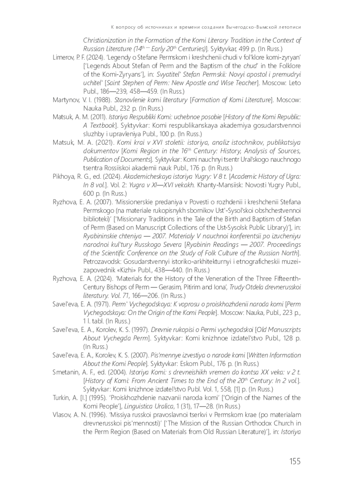31. Флоря Б. Н. Коми-Вымская летопись // Новое о прошлом нашей страны. Памяти академика М. Н. Тихомирова. М.: Наука, 1967. С. 218-231.