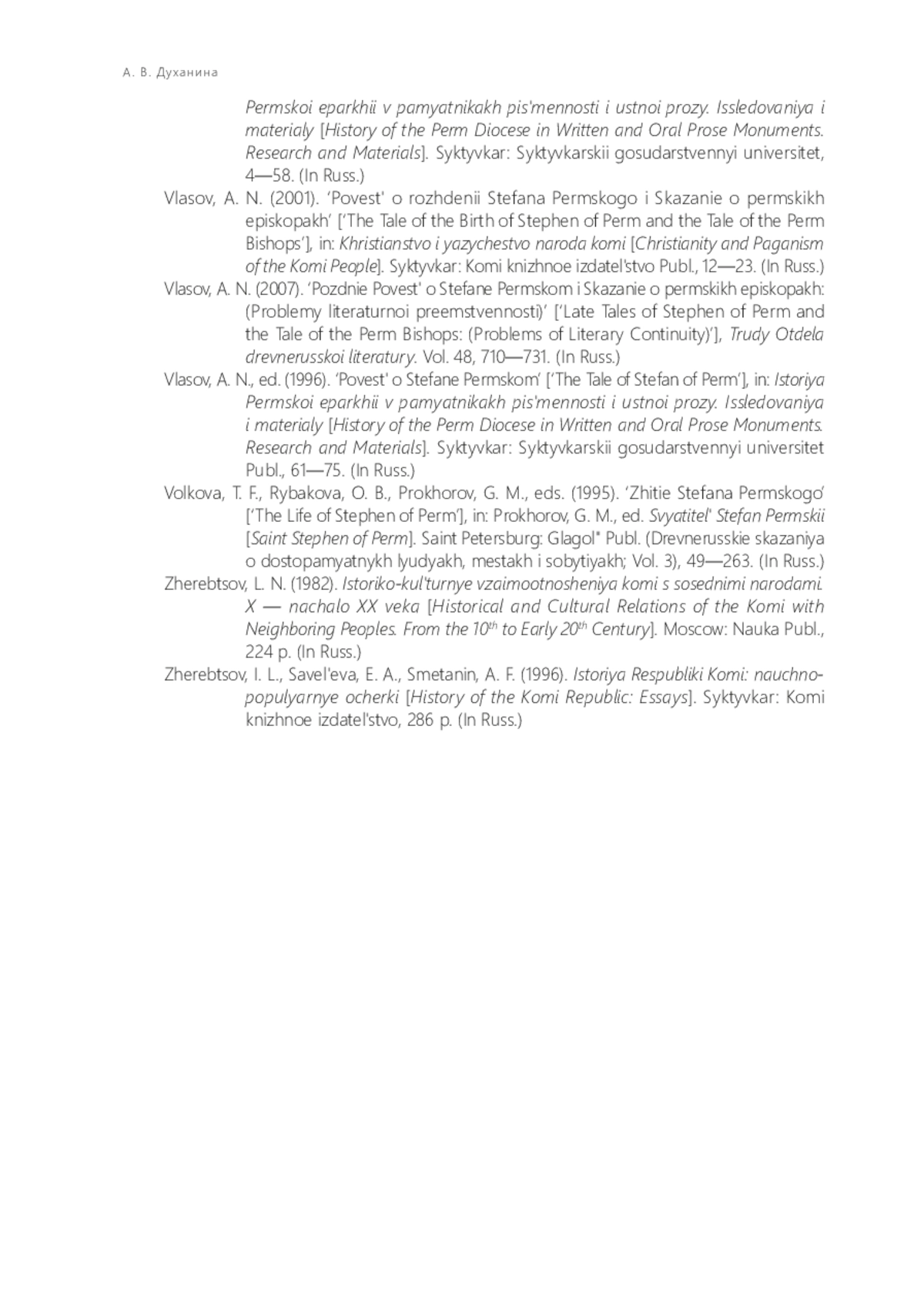 7. Духанина А. В. Повесть о Стефане Пермском: источники и рукописная традиция // Герменевтика древнерусской литературы. М.: ИМЛИ РАН, 2026. Сб. 25 (в печати).