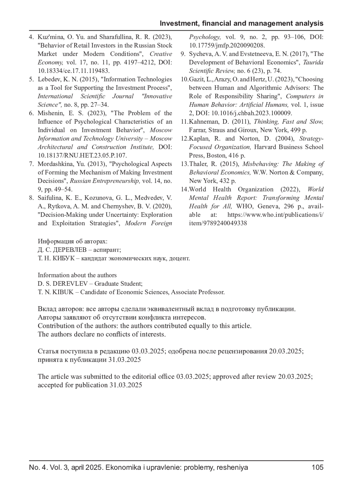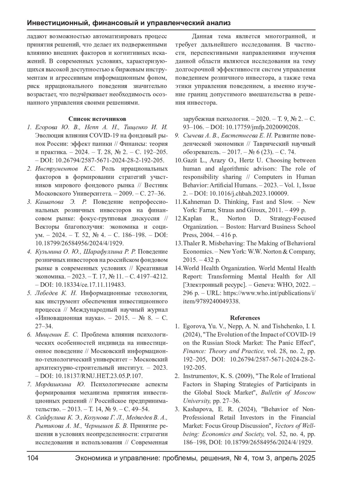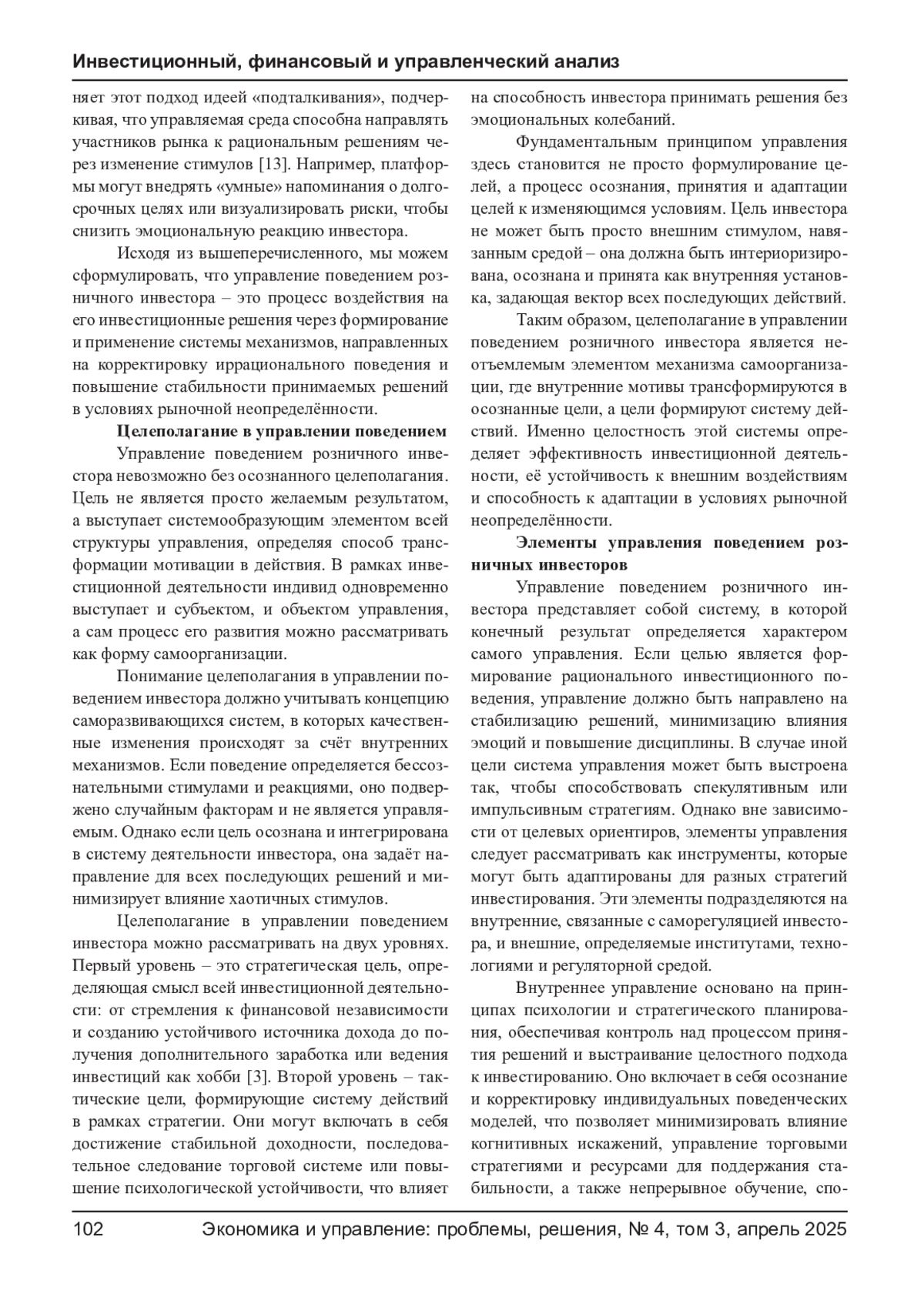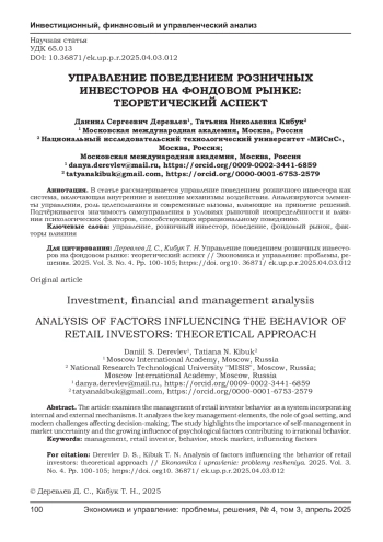 ДЕРЕВЛЕВ Д. С., КИБУК Т. Н. УПРАВЛЕНИЕ ПОВЕДЕНИЕМ РОЗНИЧНЫХ ИНВЕСТОРОВ НА ФОНДОВОМ РЫНКЕ: ТЕОРЕТИЧЕСКИЙ АСПЕКТ // ЭКОНОМИКА И УПРАВЛЕНИЕ: ПРОБЛЕМЫ, РЕШЕНИЯ. 2025. ТОМ 3 № 4