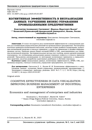 В статье исследуется роль когнитивной эффективности в визуализации данных для оптимизации управленческих решений на промышленных предприятиях. Рассмотрены ключевые принципы когнитивной психологии, включая теорию двойного кодирования, концепцию когнитивной нагрузки и гештальт-принципы, а также их применение в дизайне информационных систем. Проведен анализ бизнес-нотаций BPMN и UML, адаптированных для снижения когнитивной нагрузки. Экспериментальные методы (eye-tracking, анализ времени реакции) подтвердили, что оптимизация визуализации данных повышает скорость и точность принятия решений. Предложены рекомендации по интеграции когнитивных принципов в управленческие практики, включая разработку адаптивных дашбордов и обучение персонала.