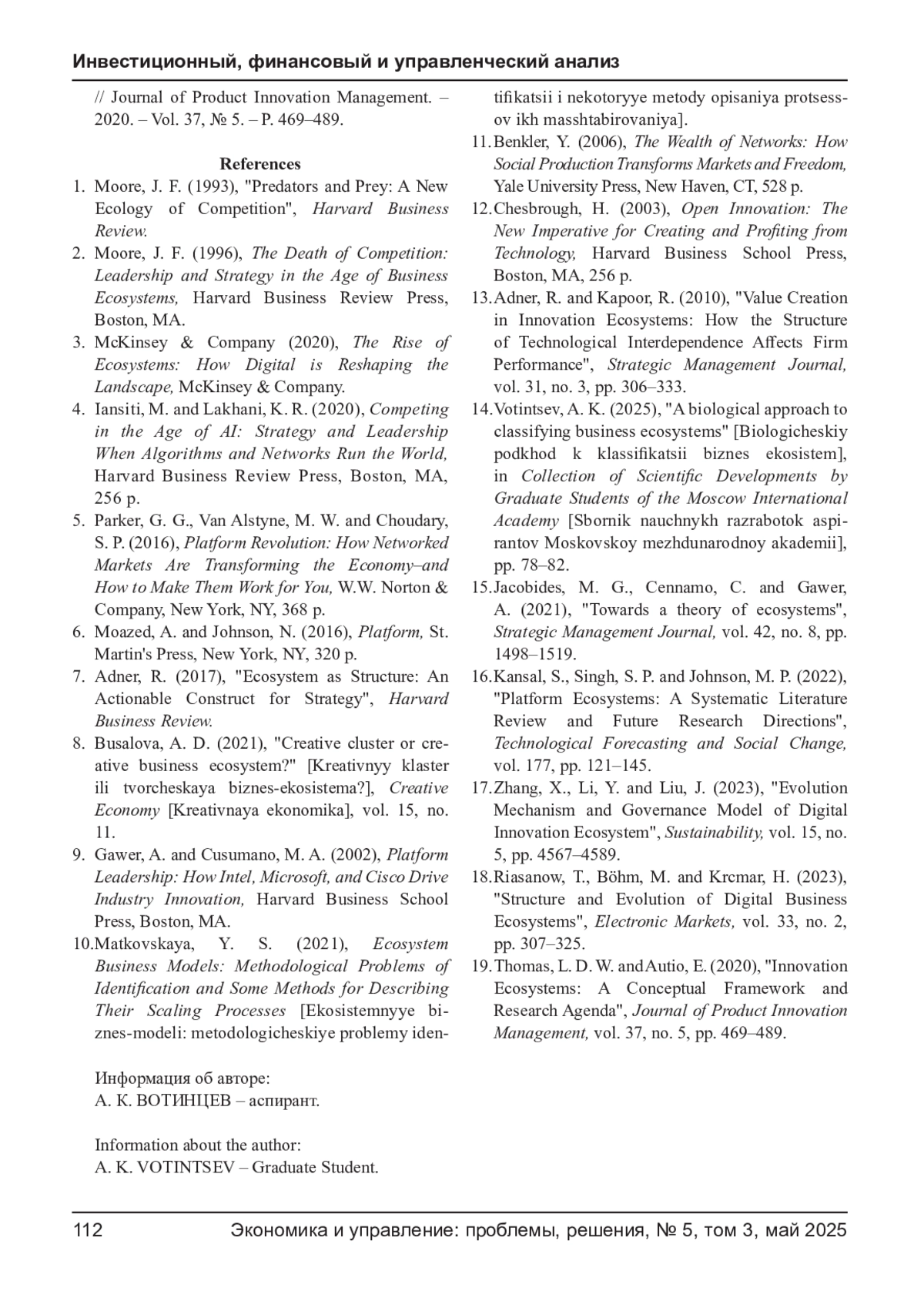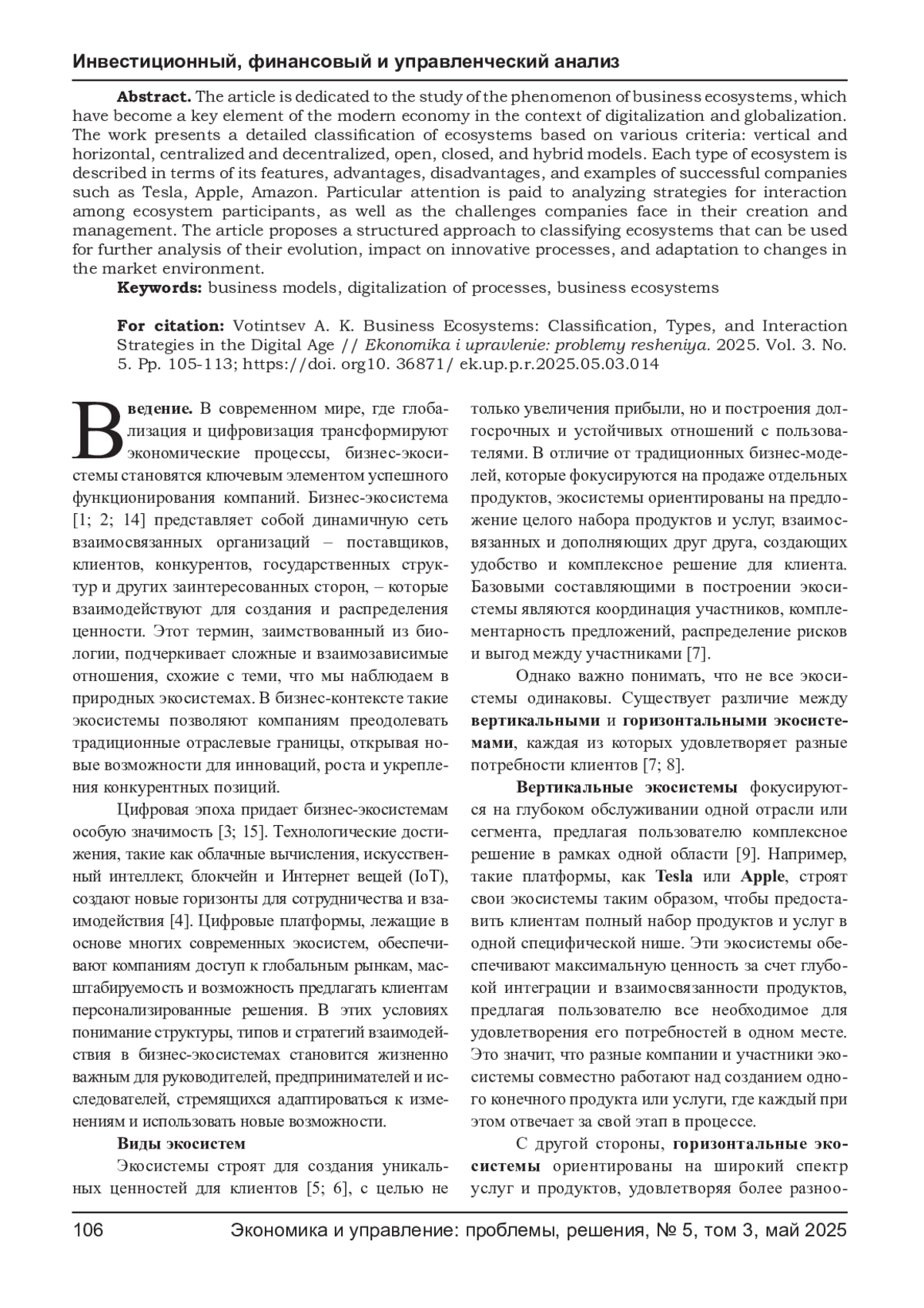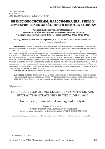 ВОТИНЦЕВ А. К. БИЗНЕС-ЭКОСИСТЕМЫ: КЛАССИФИКАЦИЯ, ТИПЫ И СТРАТЕГИИ ВЗАИМОДЕЙСТВИЯ В ЦИФРОВУЮ ЭПОХУ // ЭКОНОМИКА И УПРАВЛЕНИЕ: ПРОБЛЕМЫ, РЕШЕНИЯ. 2025. ТОМ 3 № 5