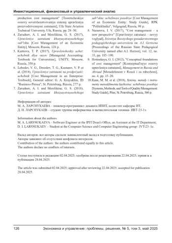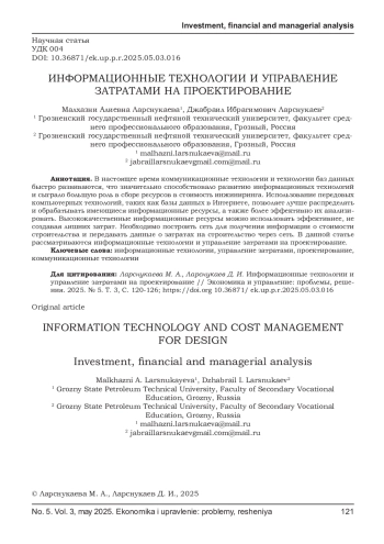 ЛАРСНУКАЕВА М. А., ЛАРСНУКАЕВ Д. И. ИНФОРМАЦИОННЫЕ ТЕХНОЛОГИИ И УПРАВЛЕНИЕ ЗАТРАТАМИ НА ПРОЕКТИРОВАНИЕ // ЭКОНОМИКА И УПРАВЛЕНИЕ: ПРОБЛЕМЫ, РЕШЕНИЯ. 2025. ТОМ 3 № 5