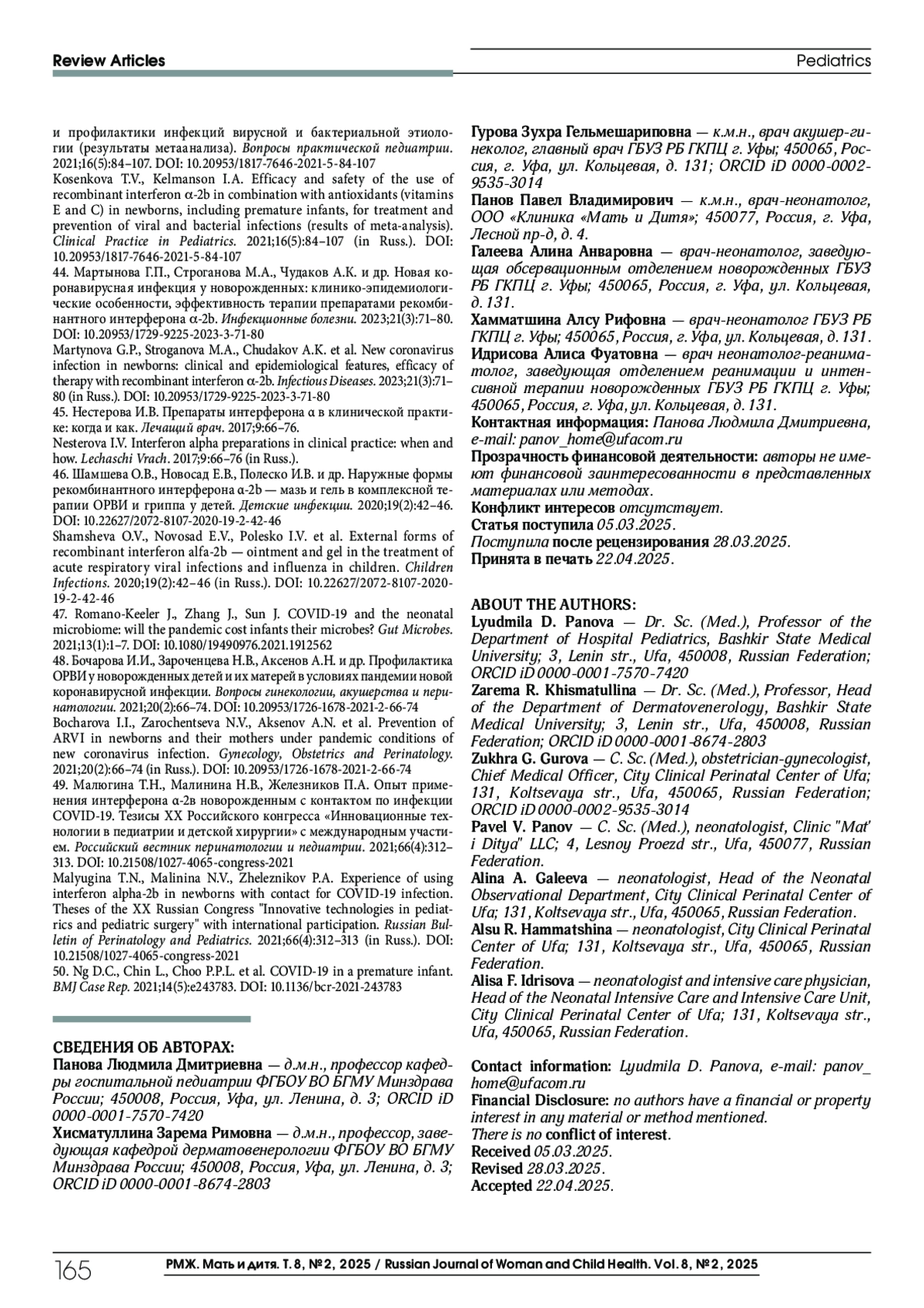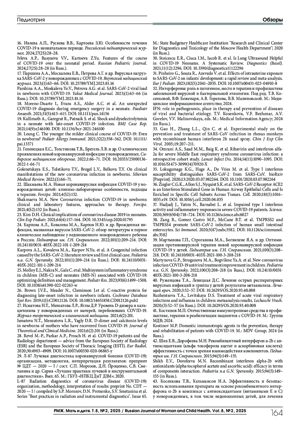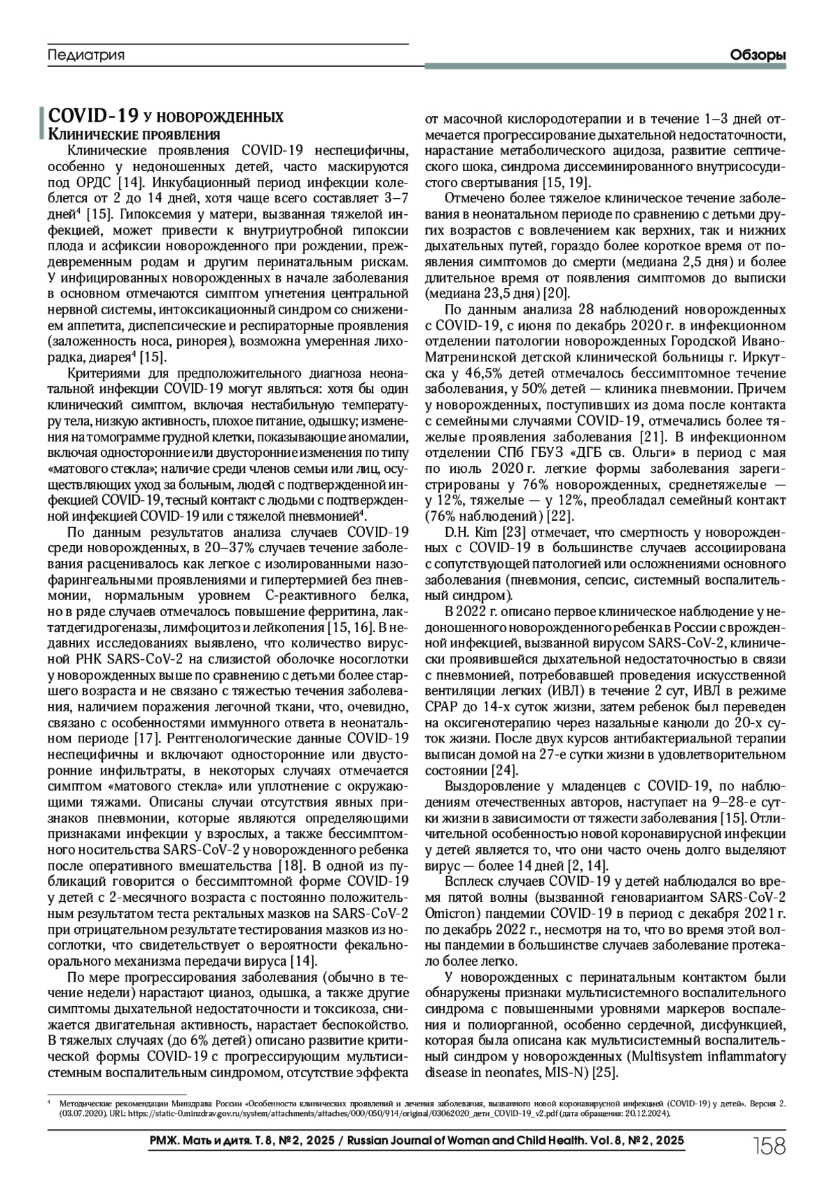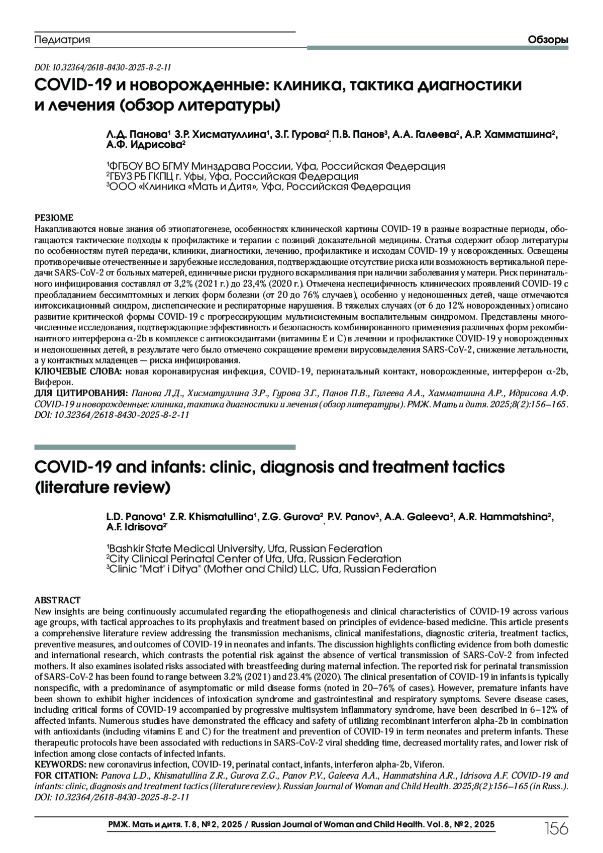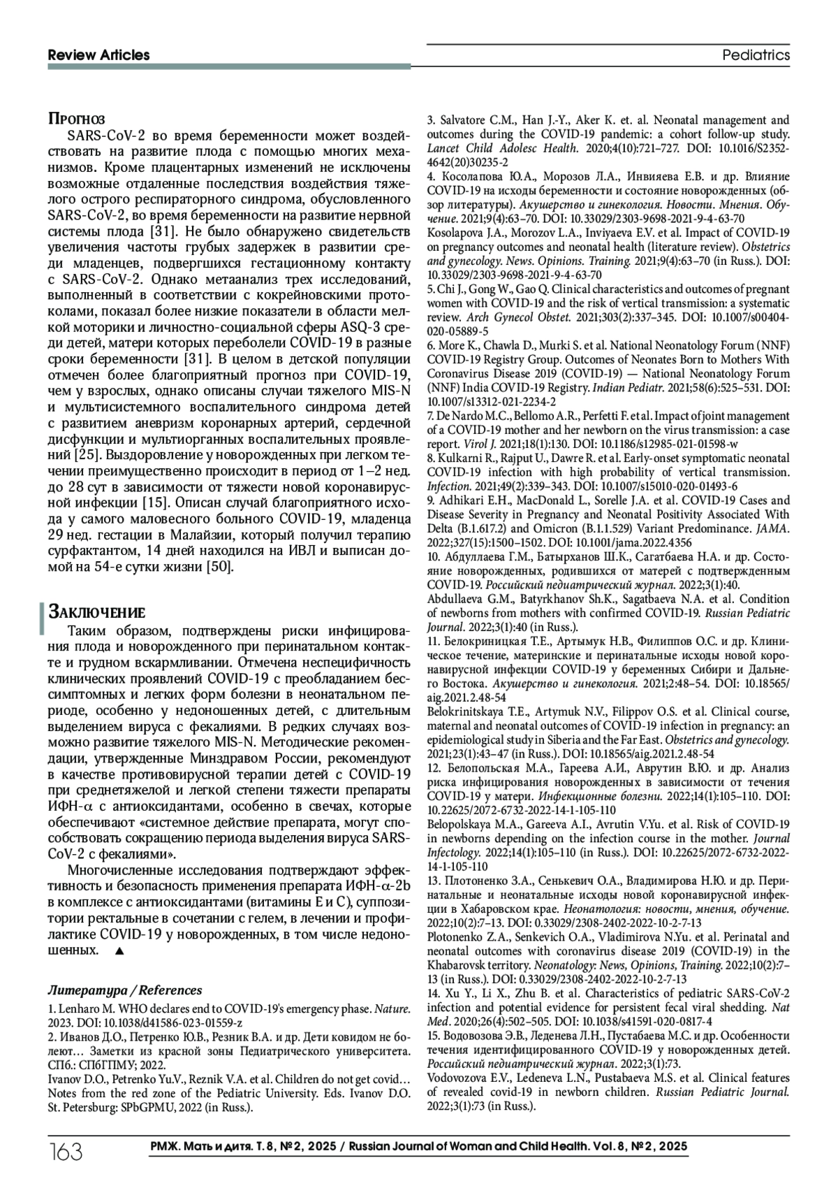 ПАНОВА Л. Д., ХИСМАТУЛЛИНА З. Р., ГУРОВА З. Г., ПАНОВ П. В., ГАЛЕЕВА А. А., ХАММАТШИНА А. Р., ИДРИСОВА А. Ф. COVID-19 И НОВОРОЖДЕННЫЕ: КЛИНИКА, ТАКТИКА ДИАГНОСТИКИ И ЛЕЧЕНИЯ (ОБЗОР ЛИТЕРАТУРЫ) // РМЖ. МАТЬ И ДИТЯ. 2025. № 2, ТОМ 8