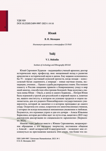 Юлий Сергеевич Худяков – выдающийся ученый-археолог, доктор исторических наук, профессор, внес неоценимый вклад в развитие археологии и исторической науки в целом. Ему недавно исполнилось бы 75 – возраст настоящей мужской зрелости, когда позади – колоссальный багаж содеянного, а впереди – новые научные планы, экс- педиции, ученики… Однако судьба распорядилась иначе.