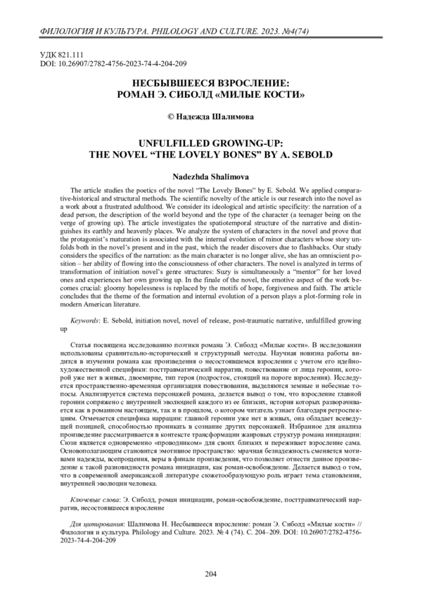 Статья посвящена исследованию поэтики романа Э. Сиболд «Милые кости». В исследовании использованы сравнительно-исторический и структурный методы. Научная новизна работы видится в изучении романа как произведения о несостоявшемся взрослении с учетом его идейно-художественной специфики: посттравматический нарратив, повествование от лица героини, которой уже нет в живых, двоемирие, тип героя (подросток, стоящий на пороге взросления). Исследуется пространственно-временная организация повествования, выделяются земные и небесные топосы. Анализируется система персонажей романа, делается вывод о том, что взросление главной героини сопряжено с внутренней эволюцией каждого из ее близких, история которых разворачивается как в романном настоящем, так и в прошлом, о котором читатель узнает благодаря ретроспекциям. Отмечается специфика наррации: главной героини уже нет в живых, она обладает всеведущей позицией, способностью проникать в сознание других персонажей. Избранное для анализа произведение рассматривается в контексте трансформации жанровых структур романа инициации: Сюзи является одновременно «проводником» для своих близких и переживает взросление сама. Основополагающим становится эмотивное пространство: мрачная безнадежность сменяется мотивами надежды, всепрощения, веры в финале произведения, что позволяет отнести данное произведение к такой разновидности романа инициации, как роман-освобождение. Делается вывод о том, что в современной американской литературе сюжетообразующую роль играет тема становления, внутренней эволюции человека.