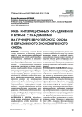 РЕЗУЛЬТАТЫ ИССЛЕДОВАНИЯ. В ходе определения эффективности институтов, структур и механизмов интеграционных объединений в обеспечении эпидемиологического благополучия выявлена их значительная роль в противодействии пандемическим и эпидемиологическим угрозам здоровью. Это отмечено действиями и мерами, принятыми Европейским союзом (ЕС) и Евразийским экономическим союзом (ЕАЭС) в ходе пандемии COVID-19. Аспекты сотрудничества между странами-участницами (транспортное сообщение, координация санитарных мер, поддержка экономики и социальной сферы, обмен информацией и опытом) и институтами этих интеграционных объединений (Еврокомиссия, Европарламент, Евразийская экономическая комиссия) были продиктованы их учредительными актами (Договором о Европейском Союзе (ДЕС), Договором о функционировании Европейского союза (ДФЕС), Договором о ЕАЭС) и иными документами.