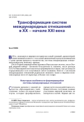 Автор рассматривает основные этапы трансформации систем международных отношений XX – начала XXI в.: Версальской, Ялтинско-Потсдамской и современной переходной. Каждой из этих систем присущи уникальные черты, формирующиеся под влиянием эпохи, интересов её участников и баланса сил. Основное внимание уделяется переходной системе, возникшей после распада СССР, её вызовам и перспективам.
