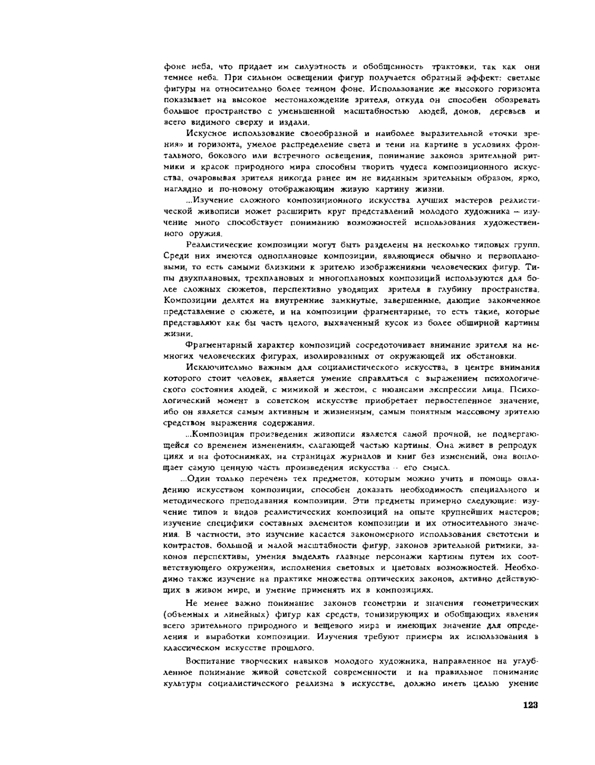 Слово «композиция» означает составление, соединение, связь. Этим словом принято обозначать то, что отдельные части картины образуют нечто целое и в этом целом приобретают большее значение, чем они имели по отдельности. Когда художник в этюде с натуры пишет человеческую фигуру или предмет, то композиция не играет очень большой роли. Но когда он принимается за картину, в которой изображается несколько фигур или предметов, в особенности когда он пишет ее не прямо с натуры, а по воображению, тогда вопросы композиции для него приобретают большое и даже решающее значение. В ходе изучения живописи.