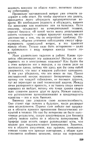 В доступной и увлекательной форме автор рассказывает об одной из современных синтетических наук — бионике, рассматривая возникновение последней как логическое следствие дифференциации и специализации различных наук. Автор знакомит читателя с основами теории информации, определяет понятия «системы», моделирования, освещает также сложные вопросы, как связь обучения и самоорганизации в живых системах, проблема биологической памяти и др. Живое изложение материала, остроумные схемы и отличные фотографии делают книгу крайне интересной и полезной широкому кругу читателей — от школьника и студента до специалиста любого профиля.