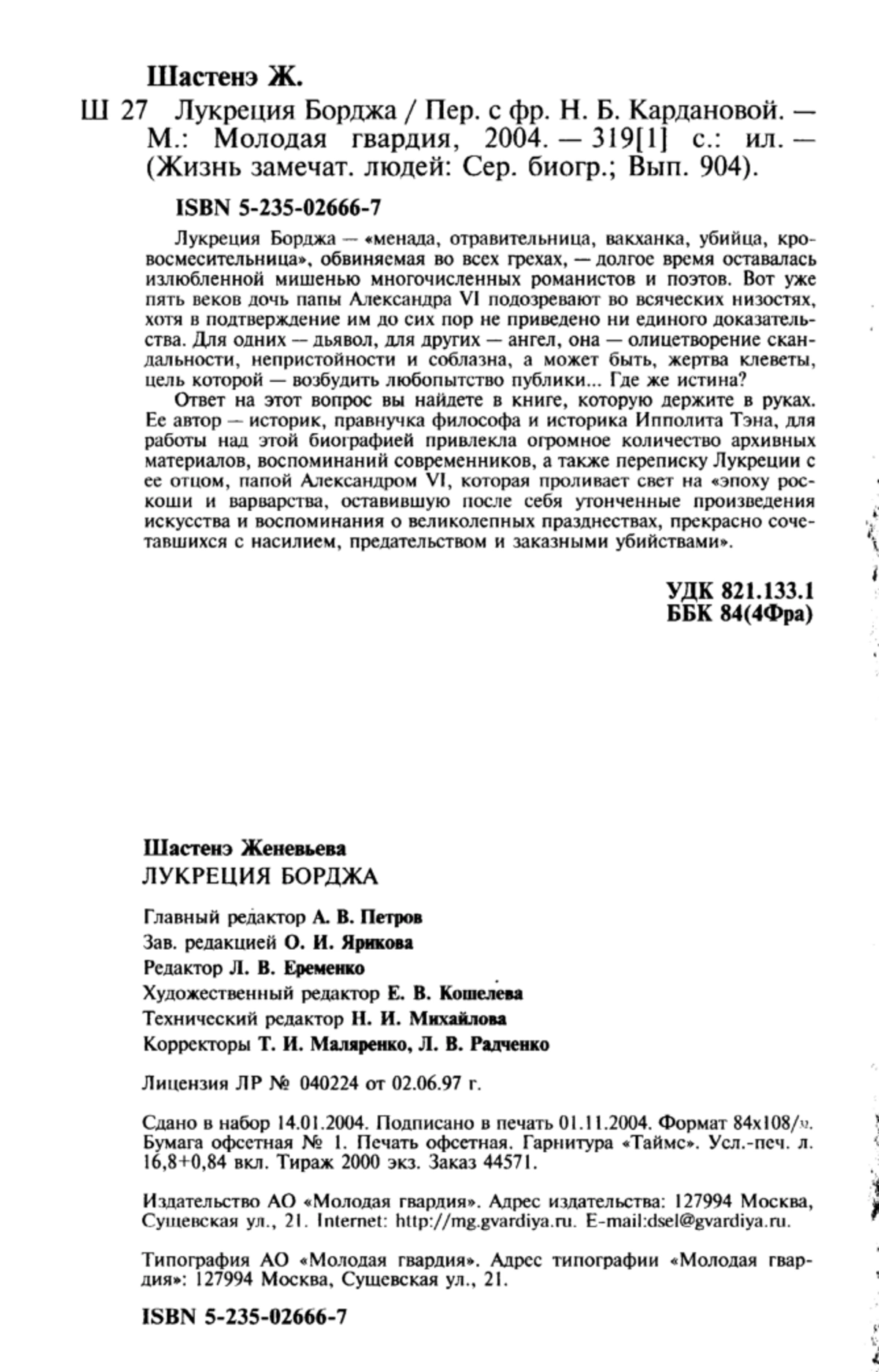 Лукреция Борджа / Пер. с фр. Н. Б. Кардановой. М.: Молодая гвардия, 2004. — 319[1] с.: ил. (Жизнь замечат. людей: Сер. биогр.; Вып. 904).