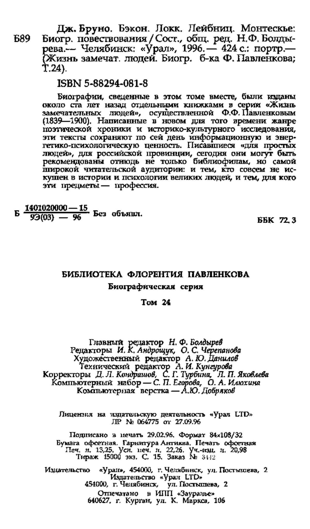 Дж. Бруно. Бэкон. Локк. Лейбниц. Монтескье: Биогр. повествования/Сост., общ. ред. Н. Ф.Болдырева.— Челябинск: «Урал», 1996.— 424 с: портр.— (Жизнь замечат. людей. Биогр. б-ка Ф. Павленкова;