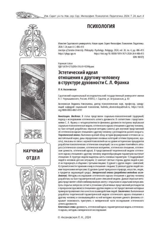 Статья: ЭСТЕТИЧЕСКИЙ ИДЕАЛ ОТНОШЕНИЯ К ДРУГОМУ ЧЕЛОВЕКУ В СТРУКТУРЕ ДУХОВНОСТИ С. Л. ФРАНКА