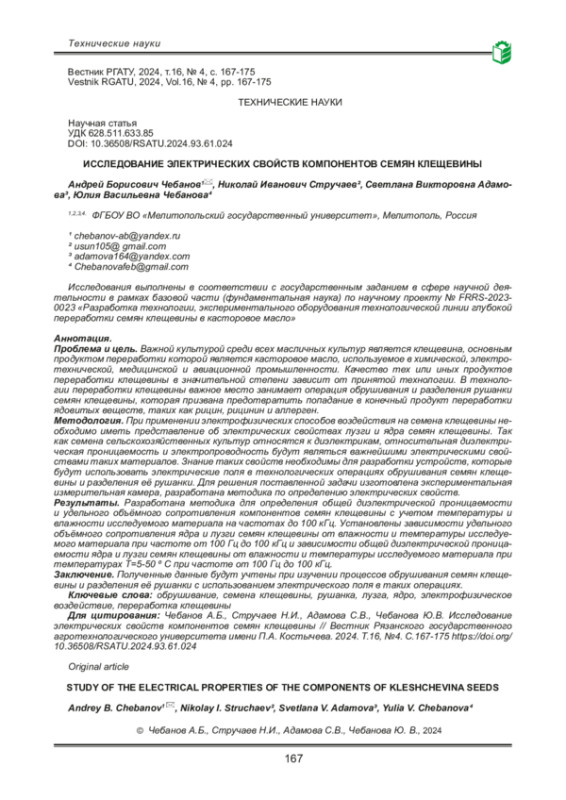 Заключение. Полученные данные будут учтены при изучении процессов обрушивания семян клещевины и разделения её рушанки с использованием электрического поля в таких операциях.