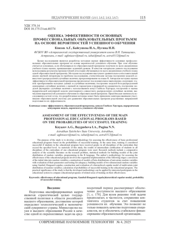 Целью исследования является разработка методики оценки эффективности основных профессиональных образовательных программ на основе вероятностей успешного обучения. При этом обучение считается успешным, если обучающиеся по образовательной программе получили по всем дисциплинам учебного плана оценки, превышающие заданный уровень. В качестве материалов данного исследования использованы результаты промежуточной аттестации обучающихся по всем дисциплинам учебного плана одной образовательной программы. Методами исследования выступают сравнительно-сопоставительный анализ научной литературы по проблеме исследования, статистические методы построения моделей совместного распределения случайных величин, программирование на языке R. Авторская методика оценки эффективности образовательной программы предполагает последовательное выполнение следующих этапов: преобразование исходных данных в случайные величины; построение моделей бета-распределений одномерных случайных величин с оценкой их параметров и проверкой на адекватность; построение моделей двумерных случайных величин с использованием копул Гамбела-Хаугарда; построение и оценка иерархической копулярной модели многомерного совместного распределения случайных величин; вычисление вероятностей успешного обучения по образовательной программе. Практическая значимость исследования состоит в том, что разработанная методика может быть применена заинтересованными участниками образовательной системы для сравнения образовательных программ родственных направлений подготовки по их эффективности.