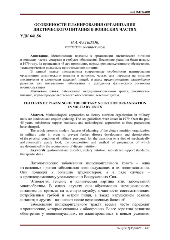 Статья: ОСОБЕННОСТИ ПЛАНИРОВАНИЯ ОРГАНИЗАЦИИ ДИЕТИЧЕСКОГО ПИТАНИЯ В ВОИНСКИХ ЧАСТЯХ