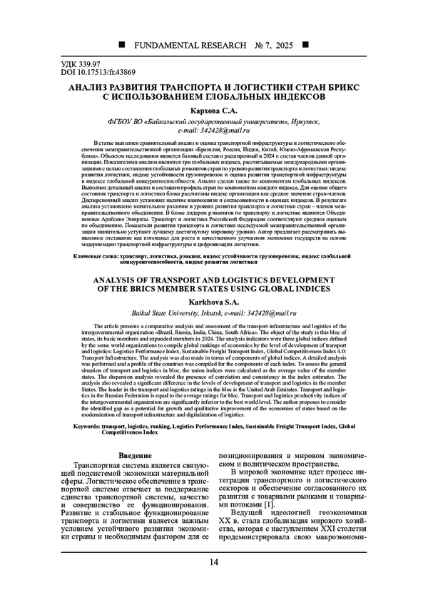 Статья: АНАЛИЗ РАЗВИТИЯ ТРАНСПОРТА И ЛОГИСТИКИ СТРАН БРИКС С ИСПОЛЬЗОВАНИЕМ ГЛОБАЛЬНЫХ ИНДЕКСОВ