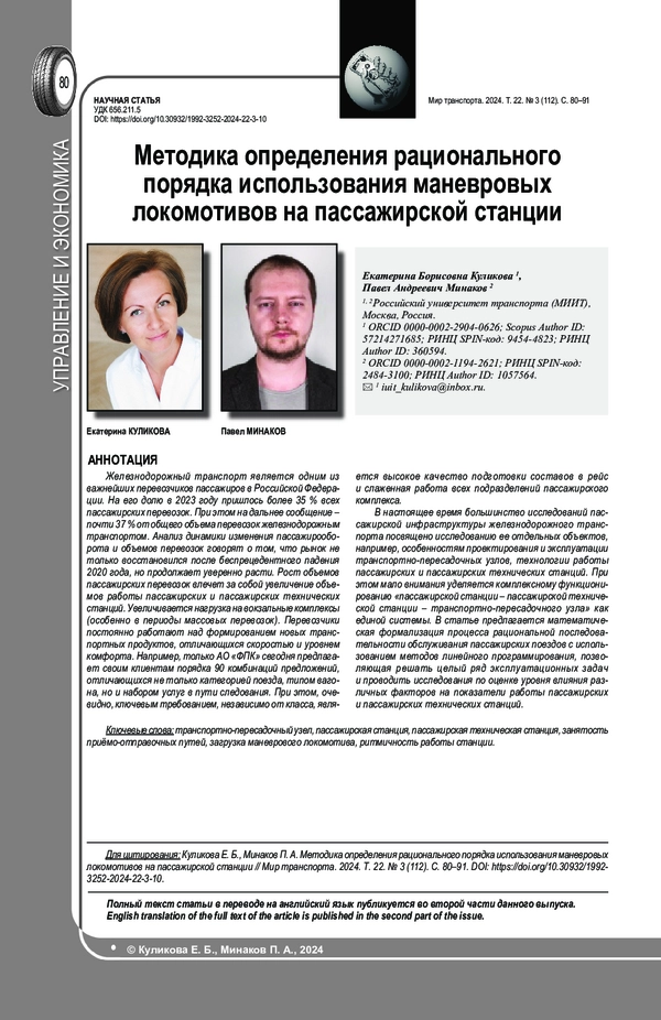 Железнодорожный транспорт является одним из важнейших перевозчиков пассажиров в Российской Федерации. На его долю в 2023 году пришлось более 35 % всех пассажирских перевозок. При этом на дальнее сообщение - почти 37 % от общего объема перевозок железнодорожным транспортом. Анализ динамики изменения пассажирооборота и объемов перевозок говорят о том, что рынок не только восстановился после беспрецедентного падения 2020 года, но продолжает уверенно расти. Рост объемов пассажирских перевозок влечет за собой увеличение объемов работы пассажирских и пассажирских технических станций. Увеличивается нагрузка на вокзальные комплексы (особенно в периоды массовых перевозок). Перевозчики постоянно работают над формированием новых транспортных продуктов, отличающихся скоростью и уровнем комфорта. Например, только АО «ФПК» сегодня предлагает своим клиентам порядка 90 комбинаций предложений, отличающихся не только категорией поезда, типом вагона, но и набором услуг в пути следования. При этом, очевидно, ключевым требованием, независимо от класса, является высокое качество подготовки составов в рейс и слаженная работа всех подразделений пассажирского комплекса. В настоящее время большинство исследований пассажирской инфраструктуры железнодорожного транспорта посвящено исследованию ее отдельных объектов, например, особенностям проектирования и эксплуатации транспортно-пересадочных узлов, технологии работы пассажирских и пассажирских технических станций. При этом мало внимания уделяется комплексному функционированию «пассажирской станции - пассажирской технической станции - транспортно-пересадочного узла» как единой системы. В статье предлагается математическая формализация процесса рациональной последовательности обслуживания пассажирских поездов с использованием методов линейного программирования, позволяющая решать целый ряд эксплуатационных задач и проводить исследования по оценке уровня влияния различных факторов на показатели работы пассажирских и пассажирских технических станций. Полный текст статьи в переводе на английский язык публикуется во второй части данного выпуска.