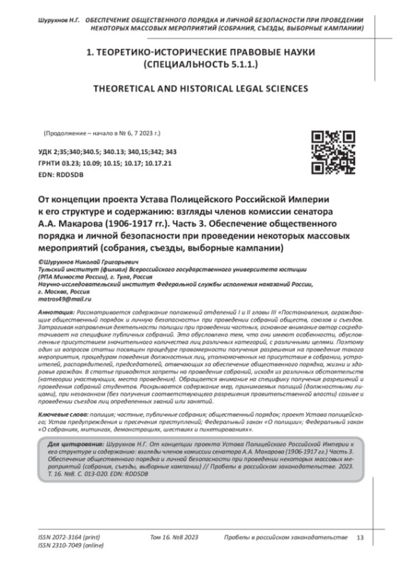 Статья: ОТ КОНЦЕПЦИИ ПРОЕКТА УСТАВА ПОЛИЦЕЙСКОГО РОССИЙСКОЙ ИМПЕРИИ К ЕГО СТРУКТУРЕ И СОДЕРЖАНИЮ: ВЗГЛЯДЫ ЧЛЕНОВ КОМИССИИ СЕНАТОРА А. А. МАКАРОВА (1906-1917 ГГ.). ЧАСТЬ 3. ОБЕСПЕЧЕНИЕ ОБЩЕСТВЕННОГО ПОРЯДКА И ЛИЧНОЙ БЕЗОПАСНОСТИ ПРИ ПРОВЕДЕНИИ НЕКОТОРЫХ МАССОВЫХ МЕРОПРИЯТИЙ (СОБРАНИЯ, СЪЕЗДЫ, ВЫБОРНЫЕ КАМПАНИИ)