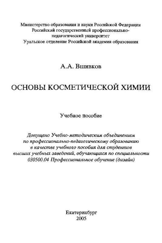 Вшивков А. А. Основы косметической химии: Учеб. пособие. Екатеринбург: Изд-во Рос. гос. проф.-пед. ун-та, 2005. 429 с.