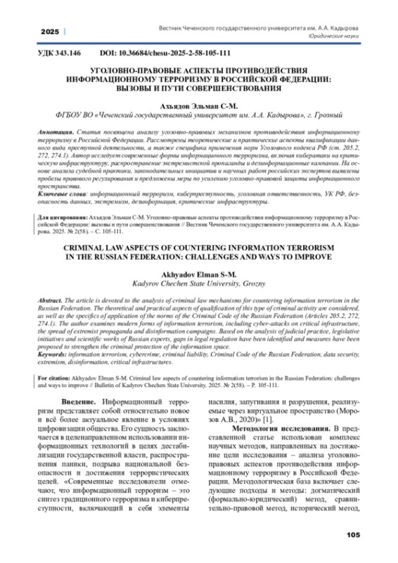 Статья: УГОЛОВНО-ПРАВОВЫЕ АСПЕКТЫ ПРОТИВОДЕЙСТВИЯ ИНФОРМАЦИОННОМУ ТЕРРОРИЗМУ В РОССИЙСКОЙ ФЕДЕРАЦИИ: ВЫЗОВЫ И ПУТИ СОВЕРШЕНСТВОВАНИЯ