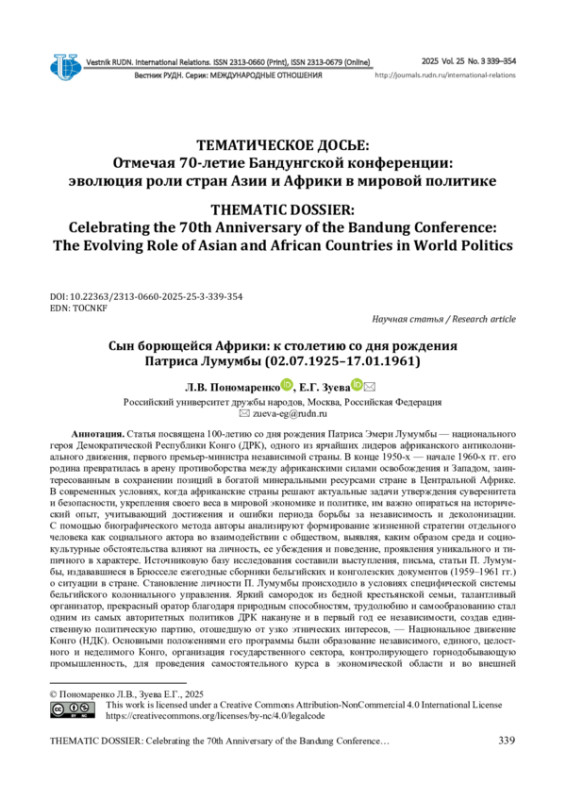 Статья посвящена 100-летию со дня рождения Патриса Эмери Лумумбы - национального героя Демократической Республики Конго (ДРК), одного из ярчайших лидеров африканского антиколониального движения, первого премьер-министра независимой страны. В конце 1950-х - начале 1960-х гг. его родина превратилась в арену противоборства между африканскими силами освобождения и Западом, заинтересованным в сохранении позиций в богатой минеральными ресурсами стране в Центральной Африке. В современных условиях, когда африканские страны решают актуальные задачи утверждения суверенитета и безопасности, укрепления своего веса в мировой экономике и политике, им важно опираться на исторический опыт, учитывающий достижения и ошибки периода борьбы за независимость и деколонизации. С помощью биографического метода авторы анализируют формирование жизненной стратегии отдельного человека как социального актора во взаимодействии с обществом, выявляя, каким образом среда и социокультурные обстоятельства влияют на личность, ее убеждения и поведение, проявления уникального и типичного в характере. Источниковую базу исследования составили выступления, письма, статьи П. Лумумбы, издававшиеся в Брюсселе ежегодные сборники бельгийских и конголезских документов (1959-1961 гг.) о ситуации в стране. Становление личности П. Лумумбы происходило в условиях специфической системы бельгийского колониального управления. Яркий самородок из бедной крестьянской семьи, талантливый организатор, прекрасный оратор благодаря природным способностям, трудолюбию и самообразованию стал одним из самых авторитетных политиков ДРК накануне и в первый год ее независимости, создав единственную политическую партию, отошедшую от узко этнических интересов, - Национальное движение Конго (НДК). Основными положениями его программы были образование независимого, единого, целостного и неделимого Конго, организация государственного сектора, контролирующего горнодобывающую промышленность, для проведения самостоятельного курса в экономической области и во внешней политике, преодоление трайбализма и регионализма, а также создание справедливого общества без нищеты и эксплуатации. В сфере внешней политики он ориентировался на нейтралитет и панафриканизм. Рассматривается, как в условиях холодной войны такая радикальная политика и бескомпромиссная позиция П. Лумумбы настроила против него Запад и прозападные силы внутри Конго, в результате чего в стране произошел кризис, приведший к убийству премьер-министра. Различные оценки деятельности П. Лумумбы вытекают прежде всего из противоположных политических позиций исследователей и политиков, а также из противоречивости мировоззрения и неоформленности программы самого политика.