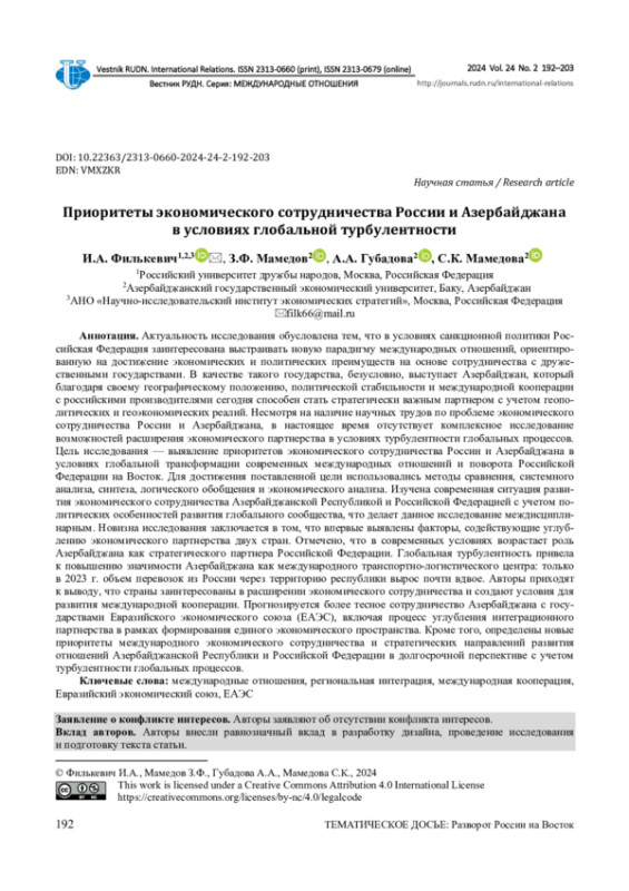 Цель исследования - выявление приоритетов экономического сотрудничества России и Азербайджана в условиях глобальной трансформации современных международных отношений и поворота Российской Федерации на Восток. Для достижения поставленной цели использовались методы сравнения, системного анализа, синтеза, логического обобщения и экономического анализа. Изучена современная ситуация развития экономического сотрудничества Азербайджанской Республикой и Российской Федерацией с учетом политических особенностей развития глобального сообщества, что делает данное исследование междисциплинарным. Новизна исследования заключается в том, что впервые выявлены факторы, содействующие углублению экономического партнерства двух стран. Отмечено, что в современных условиях возрастает роль Азербайджана как стратегического партнера Российской Федерации. Глобальная турбулентность привела к повышению значимости Азербайджана как международного транспортно-логистического центра: только в 2023 г. объем перевозок из России через территорию республики вырос почти вдвое. Авторы приходят к выводу, что страны заинтересованы в расширении экономического сотрудничества и создают условия для развития международной кооперации. Прогнозируется более тесное сотрудничество Азербайджана с государствами Евразийского экономического союза (ЕАЭС), включая процесс углубления интеграционного партнерства в рамках формирования единого экономического пространства. Кроме того, определены новые приоритеты международного экономического сотрудничества и стратегических направлений развития отношений Азербайджанской Республики и Российской Федерации в долгосрочной перспективе с учетом турбулентности глобальных процессов.