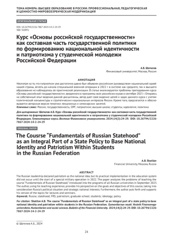 Статья: Курс «Основы российской государственности» как составная часть государственной политики по формированию национальной идентичности и патриотизма у студенческой молодежи Российской Федерации
