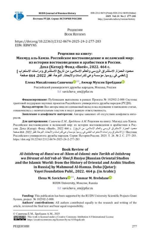 Савичева Е. М., Бребдани А. М. Рецензия на книгу: Махмуд аль-Хамза. Российское востоковедение и исламский мир: из истории востоковедения и арабистики в России. Доха (Катар): Фонд «Ваей», 2022 464 с. [ خيرات نم:يملاسلإا ملاعلاو يسورلا قارشتسلاا.ةزمحلا دومحم رطق ،ةحودلا.ثاحبلأاو تاساردلل يعو ةسسؤم.ايسور يف يملعلا بارعتسلاا تاساردو قارشتسلاا 2022.] // Вестник Российского университета дружбы народов. Серия: История России. 2025. Т. 24. № 2. С. 277–283. https://doi. org/10.22363/2312-8674-2025-24-2-277-283