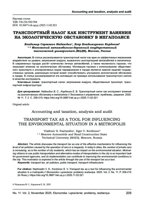 Статья: ТРАНСПОРТНЫЙ НАЛОГ КАК ИНСТРУМЕНТ ВЛИЯНИЯ НА ЭКОЛОГИЧЕСКУЮ ОБСТАНОВКУ В МЕГАПОЛИСЕ